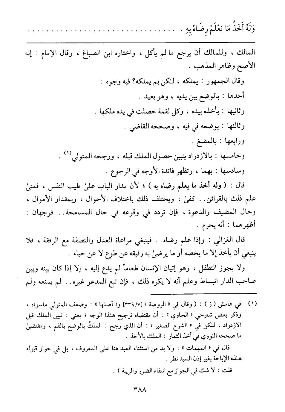 قال: (وله أخذ ماي علم رضاء به)، لأن مدار الباب على طيب النفس، فمتى علم ذلك بالقرائن .. كفى، ويختلف ذلك باختلاف الأحوال، وبمقدار الأموال، وحال المضيف والدعوة، فإن تردد في وقوعه في حال المسامحة .. فوجهان: أظهرهما: أنه يحرم.