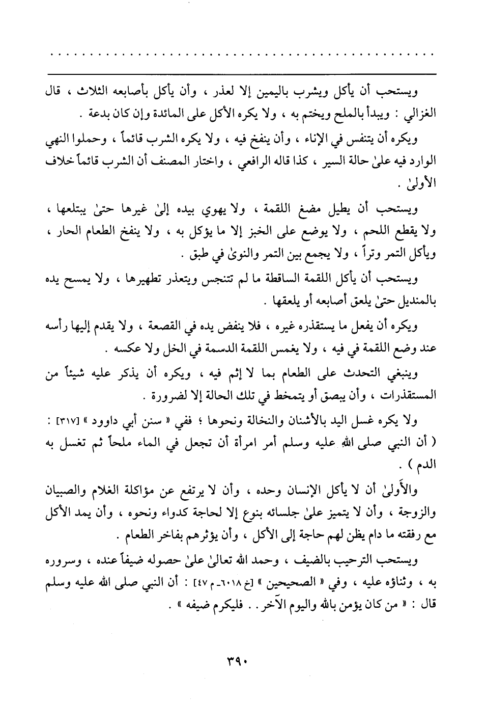 ويستحب أن يطيل مضغ القمة، ولا يهوي بيده إلى غيرها حتى يبتلعها، ولا يقطع اللحم، ولا يوضع على الخبز إلا ما يؤكل به، ولا ينفخ الطعام الحار، ويأكل التمر وترًا، ولا يجمع بين التمر والنوى في طبق.