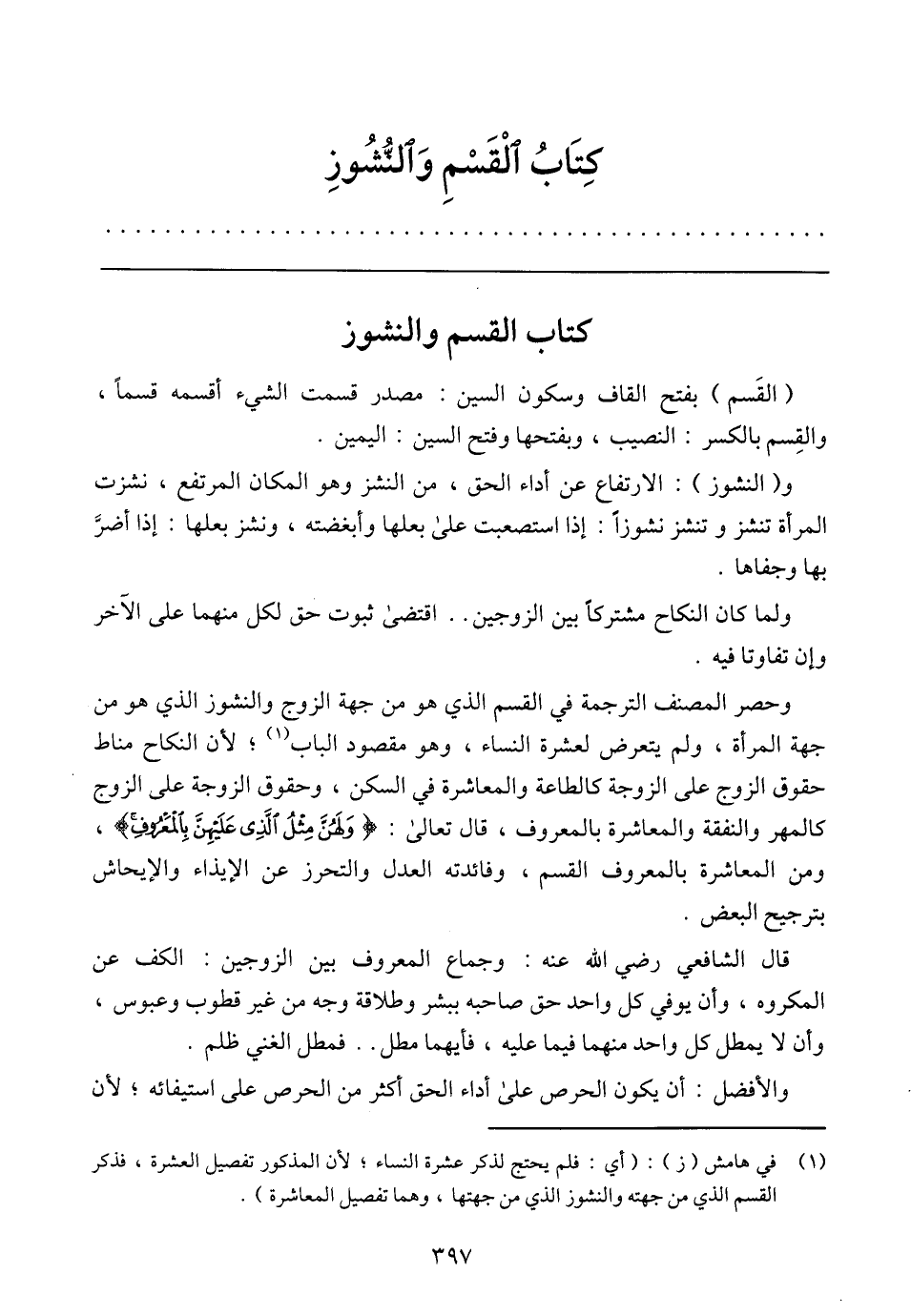 وحصر المصنف الترجمة في القسم الذي هو من جهة الزوج والنشوز الذي هو من جهة المرأة، ولم يتعرض لعشرة النساء، وهو مقصود الباب؛ لأن النكاح مناط حقوق الزوج على الزوجة كالطاعة والمعاشرة في السكن، وحقوق الزوجة على الزوج كالمهر والنفقة والمعاشرة بالمعروف، قال تعالى: {ولَهُنَّ مِثْلُ الَّذِي عَلَيْهِنَّ بِالْمَعْرُوفِ}، ومن المعاشرة بالمعروف القسم، وفائدته العدل والتحرز عن الإيذاء والإيحاش بترجيح البعض.