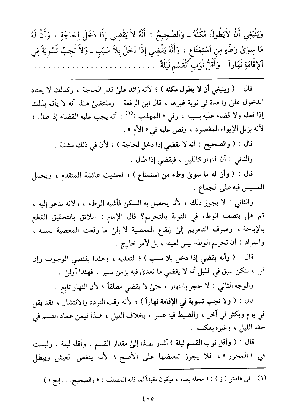 قال: (واقل نوب القسم ليلة) أشار بهذا إلى مقدار القسم، وأقله ليلة، وليست في (المحور)، فلا يجوز تبعيضها على الأصح، لأنه ينغص العيش ويبطل