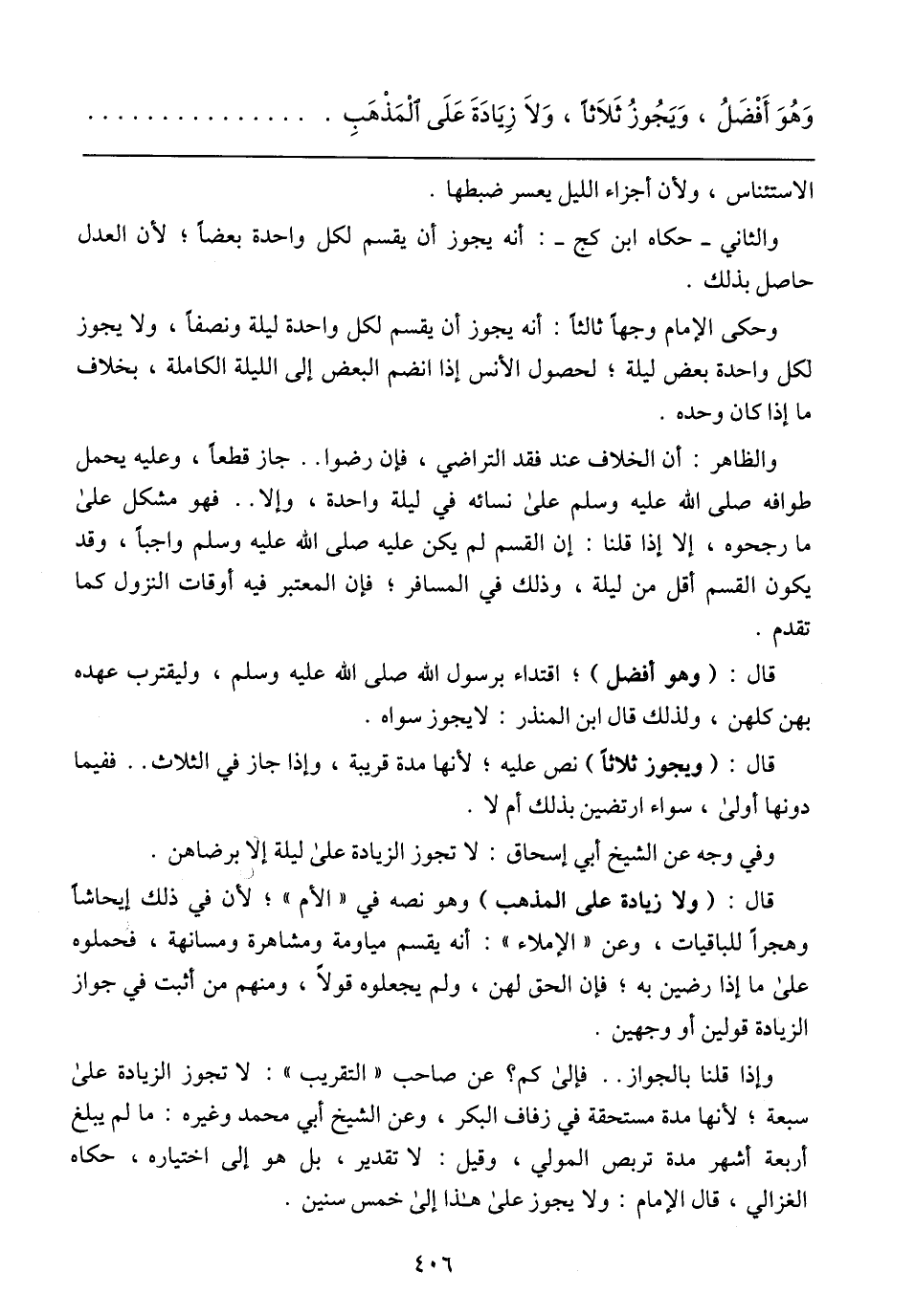 والظاهر: أن الخلاف عند فقد التراضي، فإن رضوا .. جاز قطعًا، وعليه يحمل طوافه صلي الله عليه وسلم على نسائه في ليلة واحدة، وإلا .. فهو مشكل على ما رجحوه، إلا إذا قلنا: إن القسم لم يكن عليه صلي الله عليه وسلم واجبًا، وقد يكون القسم أقل من ليلة، وذلك في المسافر؛ إن المعتبر فيه أوقات النزول كما تقدم.