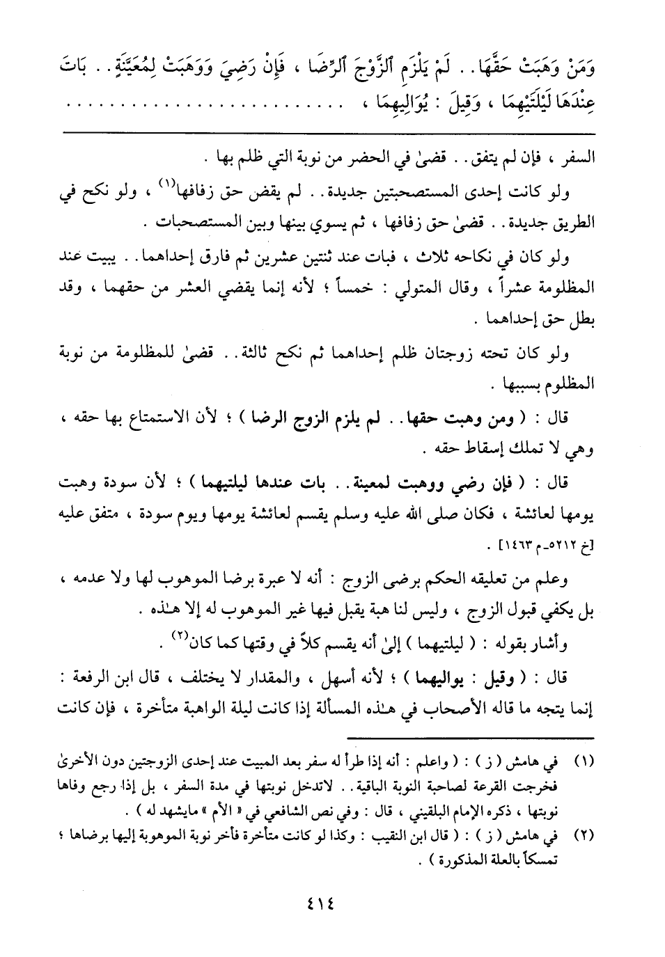 قال: (فإن رضي ووهبت لميعنة .. بات عندها ليلتهما)؛ لأن سودة وهبت يومها لعائشة، فكان صلي الله عليه وسلم يقسم لعائشة يومها ويوم سودة، متفق عليه [خ 5212 - م 1463].