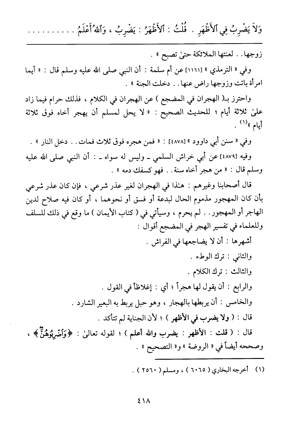 واحترز بـ (الهجران في المضجع) عن الهجران في الكلام، فذلك حرام فيما زاد على ثلاثة أيام؛ للحديث الصحيح: (لا يحل لمسلم أن يهجر أخاه فوق ثلاثة أيام).