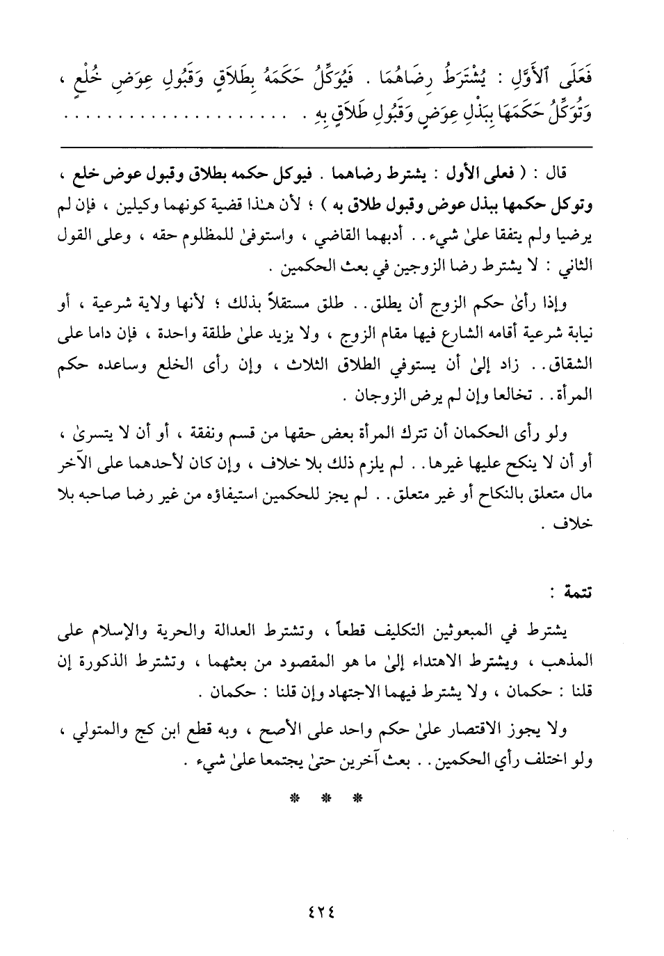 وإذا رأى حكم الزوج أن يطلق .. طلق مستقلاً بذلك؛ لأنها ولاية شرعية، أو نيابة شرعية أقامه الشارع فيها مقام الزوج، ولا يزيد على طلقة واحدة، فإن داما على الشقاق .. زاد إلى أن يستوفى الطلاق الثلاث، وإن رأى الخلع وساعده حكم المرأة .. تخالعا وإن لم يرض الزوجان.