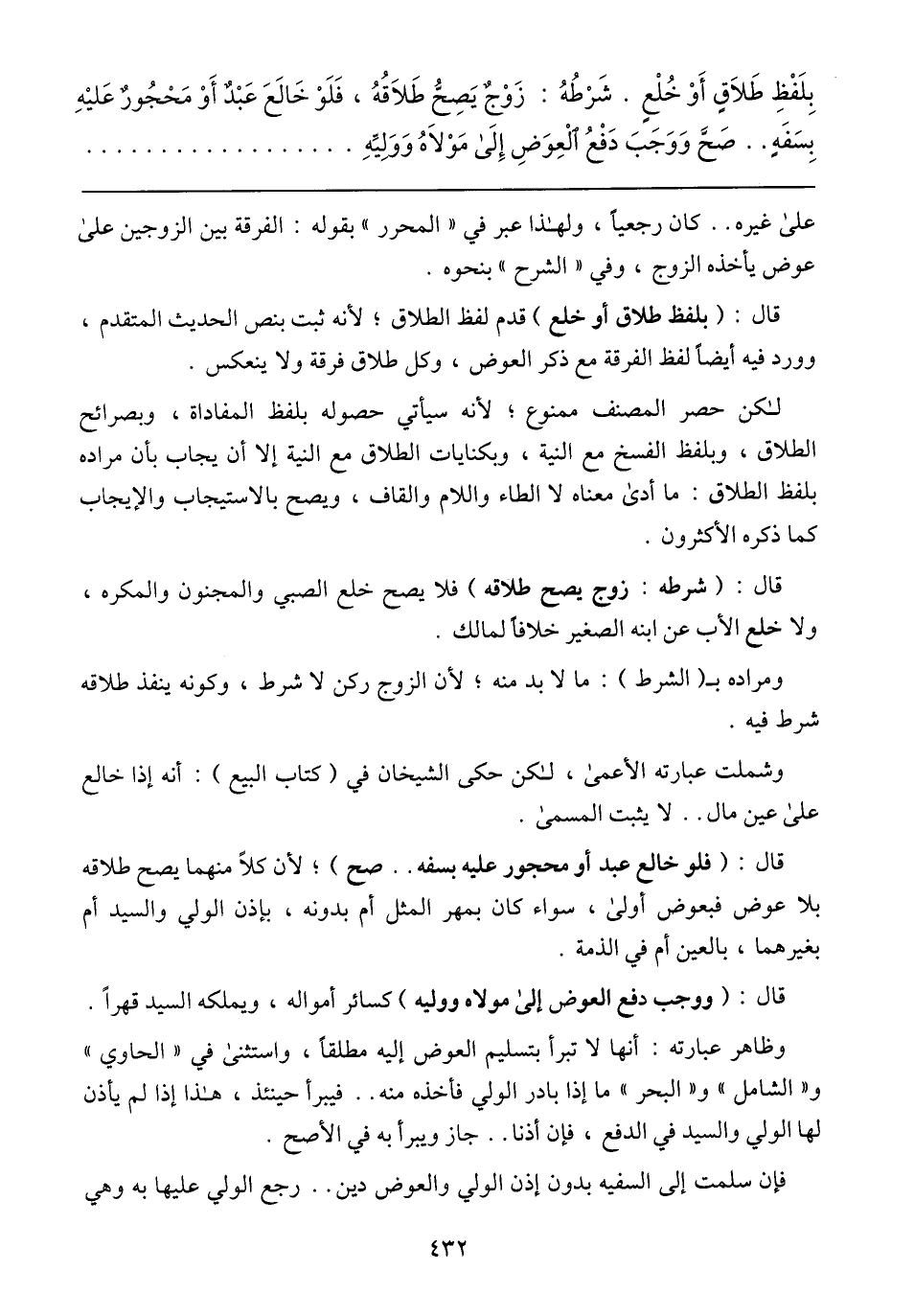 بلَفْظِ طَلاَقٍ أَوْ خُلْعٍ. شَرْطُةُ: زَوْجٌ يَصِحُّ طَلاَقُهُ، فَلَوْ خَالَعَ عَبْدٌ أَوْ مَحْجُور عَليْهِ بِسَفَهِ .. صَحَّ وَوَجَبَ دَفْعُ اَلْعِوَضِ إِلَى مَوْلاَهُ وَوَلِيِّهِ