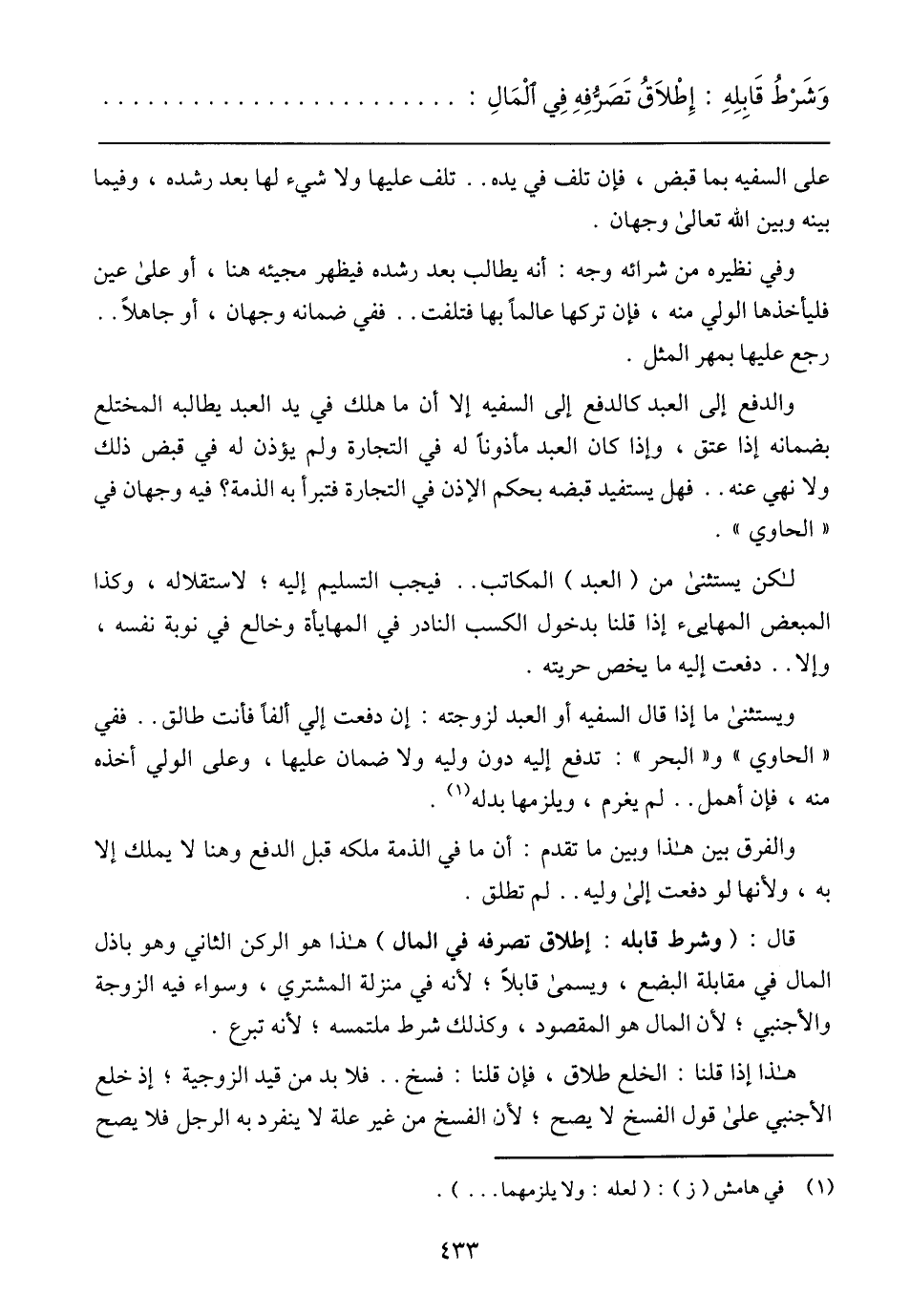 ويستثنى ما إذا قال السفينة أو العبد لزوجته: إن دفعت إلى ألفًا فأنت طالق .. ففي (الحاوي) و (البحر): تدفع إليه دون وليه ولا ضمان عليها، وعلى الولي أخذه منه، فإن أهمل .. لم يغرم، ويلزمها بدله.