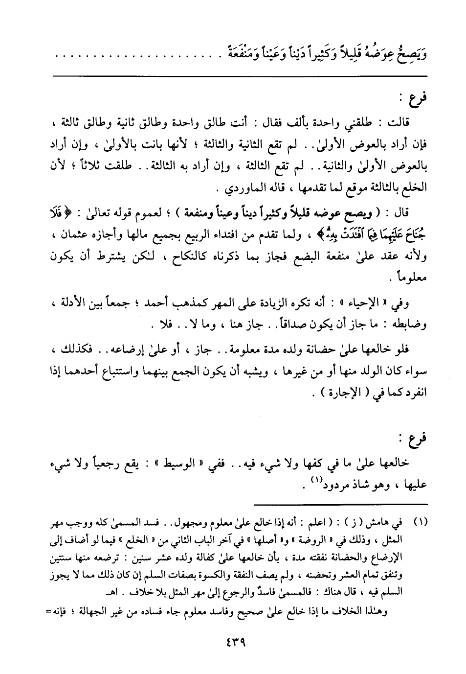 قال: (ويصح عوضه قليلاً وكثيرًا دينًا وعينًا ومنفعة)؛ لعموم قوله تعالى: {فَلا جُنَاحَ عَلَيْهِمَا فِيمَا افْتَدَتْ بِهِ}، ولما تقدم من افتداء الربيع بجميع مالها وأجازه عثمان، ولأنه عقد على منفعة البضع فجاز بما ذكرناه كالنكاح، لكن يشترط أن يكون معلومًا.