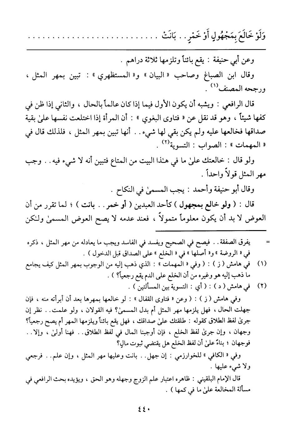 قال الرافعي: ويشبه أن يكون الأول فيما إذا كان عالمًا بالحال، والثاني إذا ظن في كفها شيئًا، وهو قد نقل عن (فتاوي البغوي): أن المراة إذا اختلعت نفسها على بقية صداقها فخالعها عليه ولم يكن بقى لها شيء .. أنها تبين بمهر المثل، فلذلك قال في (المهمات): الصواب: التسوية.