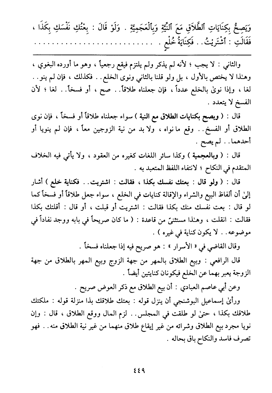قال: (ولو قال: بعتك نفسك بكذا، فقالت: اشتريت .. فكناية خلع) أشار إلى أن ألفاظ البيع والشراء والإقالة كنايات في الخلع، سواء جعل طلاقًا أو فسخًا كما لو قال: بعت نفسك منك بكذا فقالت: اشتريت أو قبلت، أو قال: أقلتك بكذا فقالت: انقلت، وهذا مستثنى من قاعدة: (ما كان صريحًا في بابه ووجد نفادًا في موضوعه .. لا يكون كناية في غيره).