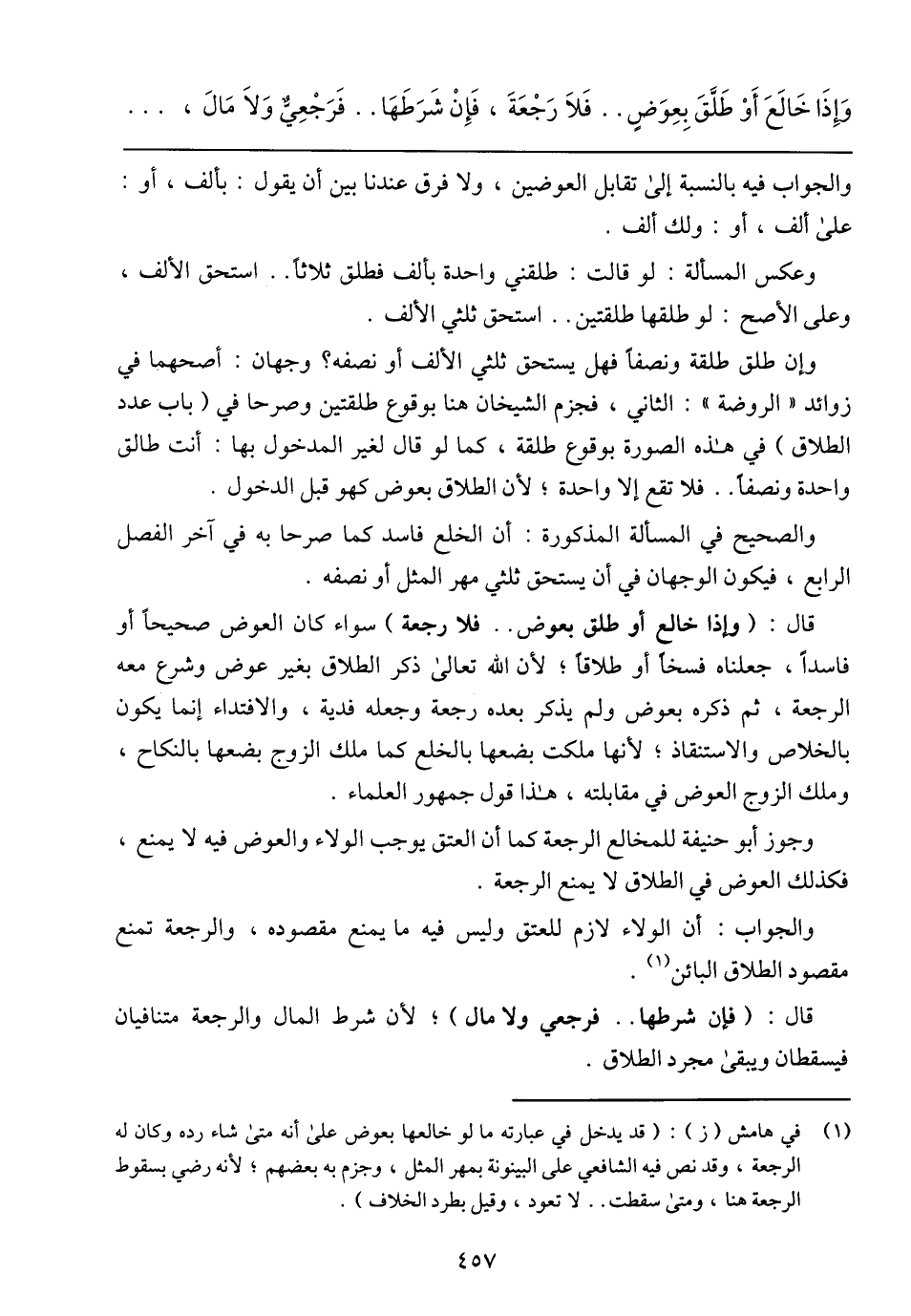 وَإِذَا خَالَعَ أَوْ طَلَّقَ بِعِوَضٍ .. فَلَا رَجْعَةَ، فَإِنْ شَرَطَهَا .. فَرَجْعِيٌّ وَلَا مَالَ،