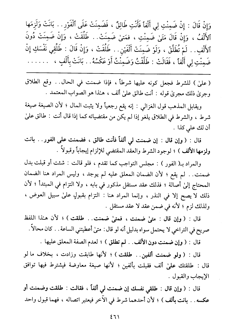 وَإِنْ قَالَ: إِنْ ضَمِنْتِ لِي أَلْفًا فَأَنْتِ طَالِقٌ، فَضَمِنَتْ عَلَى الْفَوْرِ .. بَانَتْ وَلَزِمَها الأَلْفُ، وَإِنْ قَالَ مَتَى ضَمِنْتِ، فَمَتى ضَمِنَتْ .. طَلُقَتْ، وَإِنْ ضَمِنَتْ دُونَ الأَلْفِ .. لَمْ تُطَلَّقْ، وَلَوْ ضَمِنَتْ أَلْفَيْنِ .. طَلُقَتْ، وَإِنْ قَالَ: طَلِّقِي نَفْسَكِ إِنْ ضَمِنْتِ لِي أَلْفًا، فَقَالَتْ: طَلَّقْتُ وَضَمِنْتُ أَوْ عَكْسُهُ .. بَانَتْ بِأَلْفٍ،