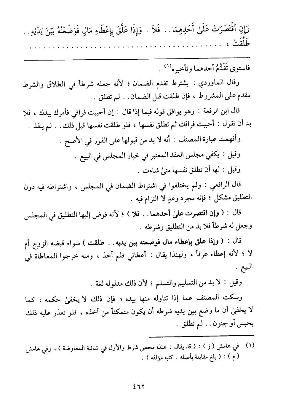 قال الرافعي: ولم يختلفوا في اشتراط الضمان في المجلس، واشتراط فيه دون التطليق مشكل؛ فإنه مجرد وعدٍ لا التزام فيه.