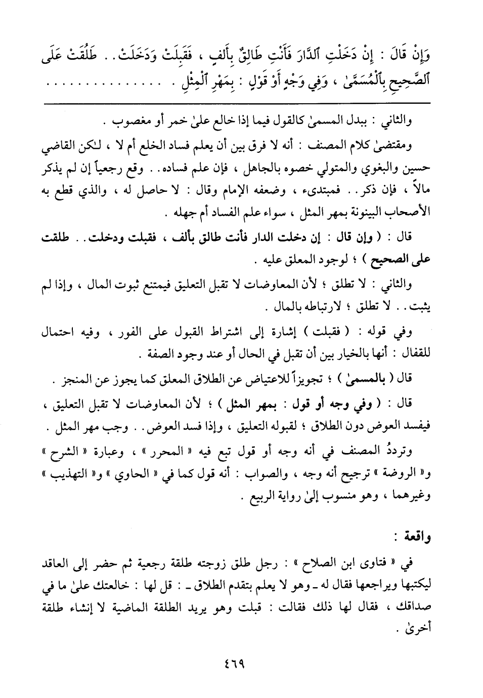 في (فتاوى ابن الصلاح): رجل طلق زوجته طلقة رجعية ثم حضر إلى العاقد ليكتبها ويراجعها فقال له- وهو لا يعلم بتقدم الطلاق-: قل لها: خالعتك على ما في صداقك، فقال لها ذلك فقالت: قبلت وهو يريد الطلقة الماضية لا إنشاء طلقة أخرى.