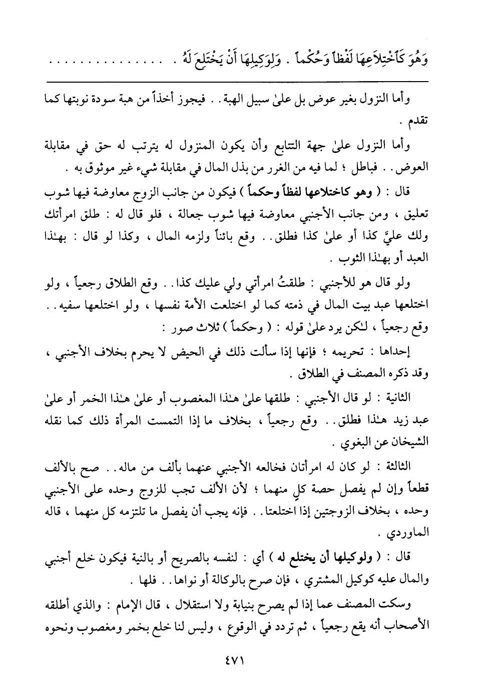 ولو قال هو للأجنبي: طلقتُ امرأتي ولي عليك كذا .. وقع الطلاق رجعياً، ولو اختلعها عبد بيت المال في ذمته كما لو اختلعت الأمة نفسها، ولو اختلعها سفيه .. وقع رجعياً، لكن يرد على قوله: (وحكماً) ثلاث صور: