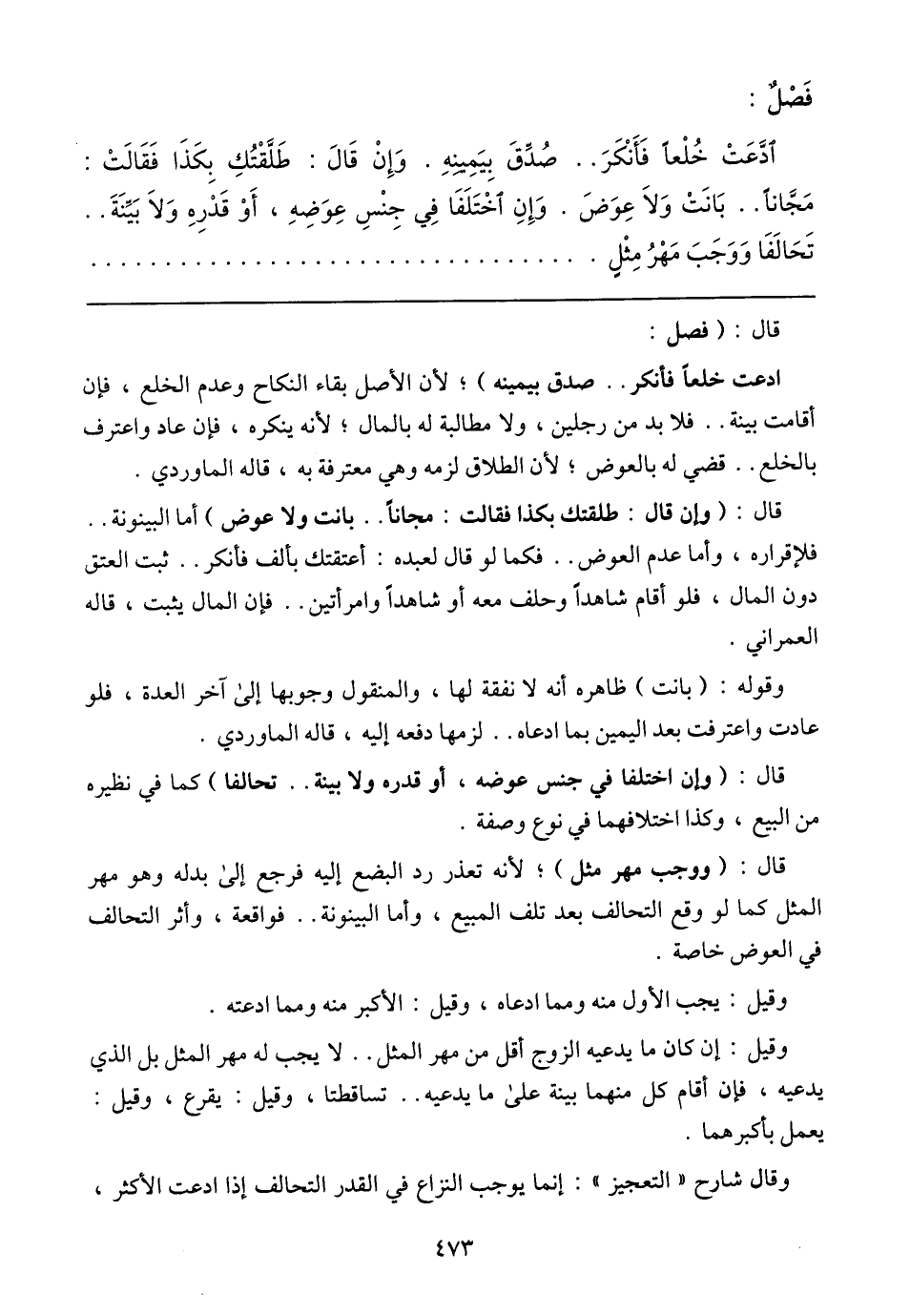 ادَّعَتْ خُلعاً فَأَنْكَرَ .. صُدِّقَ بِيَمِينِهِ. وَإِنْ قَالَ: طَلَّقْتُكِ بِكَذَا فَقَالَتْ: مَجَّاناً .. بَانَتْ وَلاَ عِوَضَ. وَإِنِ اخْتَلَفَا فِي جِنْسِ عِوَضِهِ، أَزْ قَدْرِهِ وَلاَ بَيِّنَةَ .. تَحَالَفَا وَوَجَبَ مَهْرُ مِثْلٍ