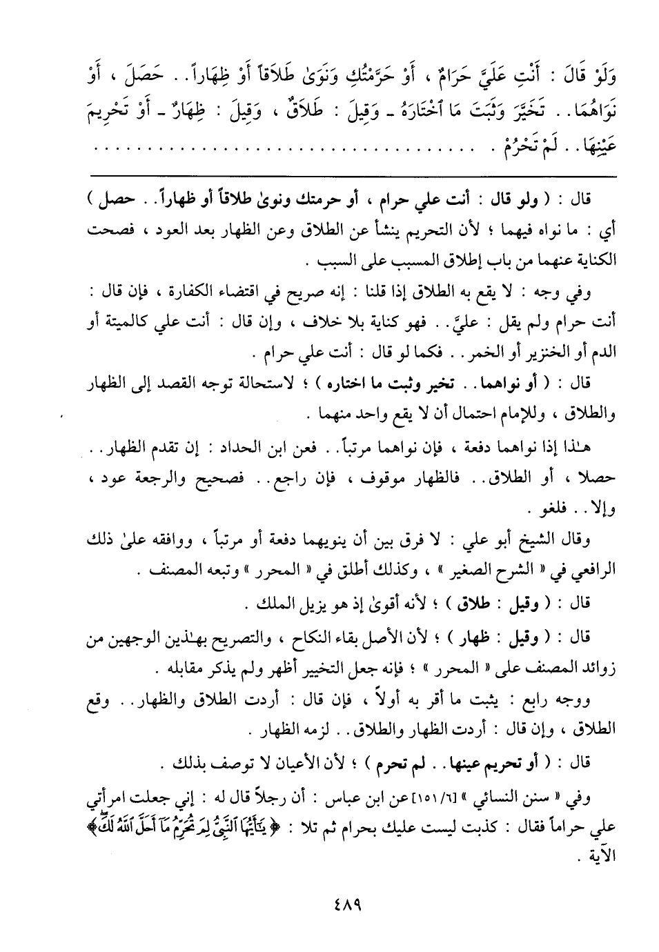 وفي (سنن النسائي)] 6/ 151 [عن ابن عباس: أن رجلاً قال له: إني جعلت امرأتي علي حراماً فقال: كذبت ليست عليك بحرام ثم تلا:} يَأَيُّهَا اَلنَّبِيُّ لِمَ تُحَرِّمُ مَآ أَحَلَ اللهُ لَكَصلى {الآية.