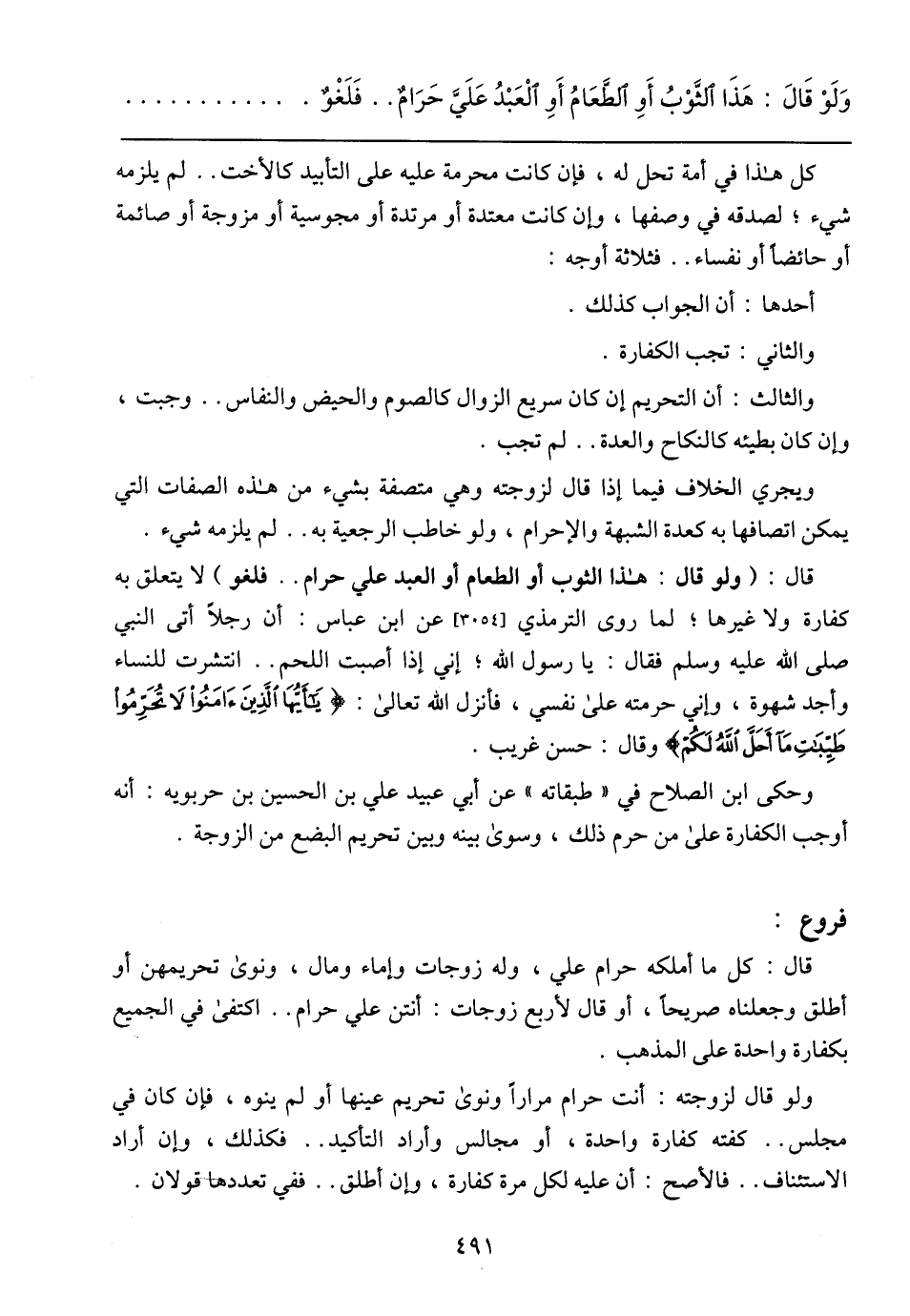 وحكى ابن الصلاح في (طبقاته) عن أبي عبيد علي بن الحسين بن حربويه: أنه أوجب الكفارة على من حرم ذلك، وسوى بينه وبين تحريم البضع من الزوجة.