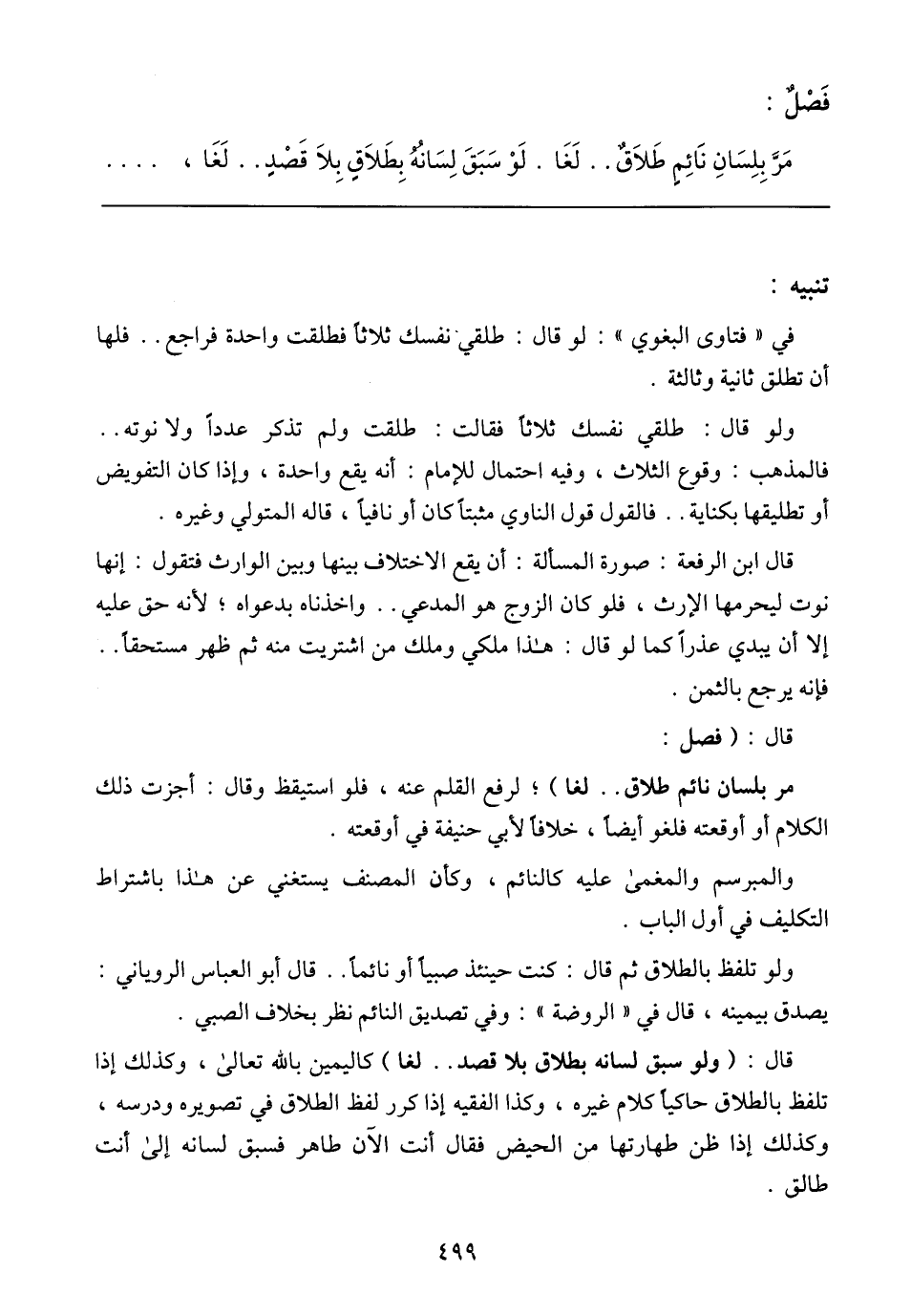 مَرَّ بِلِسَانِ نَائِمٍ طَلاَقٌ .. لَغَا. لَوْ سَبَقَ لِسَانُهُ بِطَلاَقٍ بِلاَ قَصْدٍ .. لَغَا،