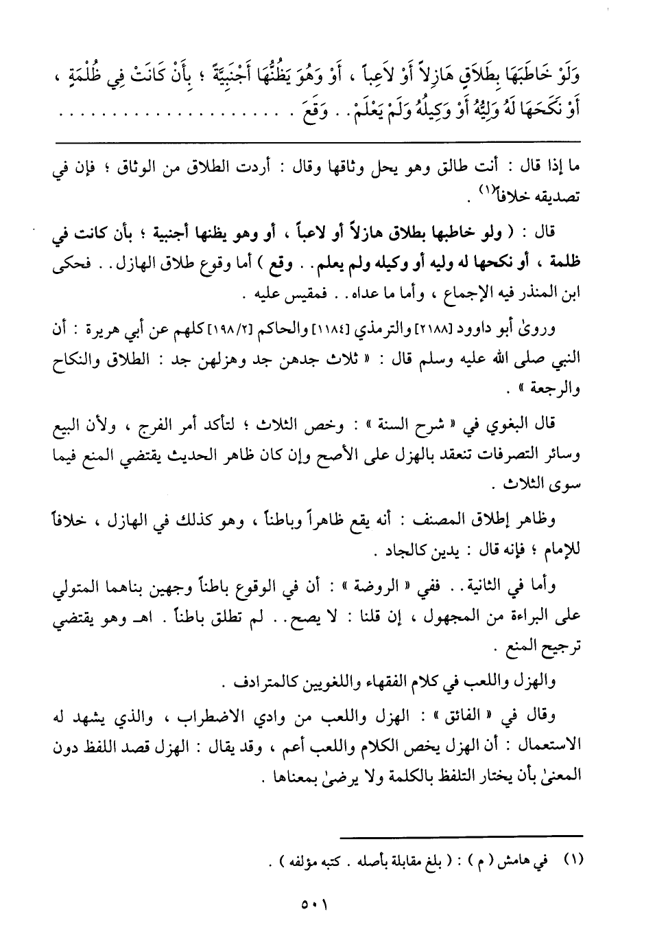 وروى أيو داوود] 2188 [والترمذي] 1184 [والحاكم] 2/ 198 [كلهم عن أبي هريرة: أن النبي صلى الله عليه وسلم قال: (ثلاث جدهن جد وهزلهن جد: الطلاق والنكاح والرجعة).