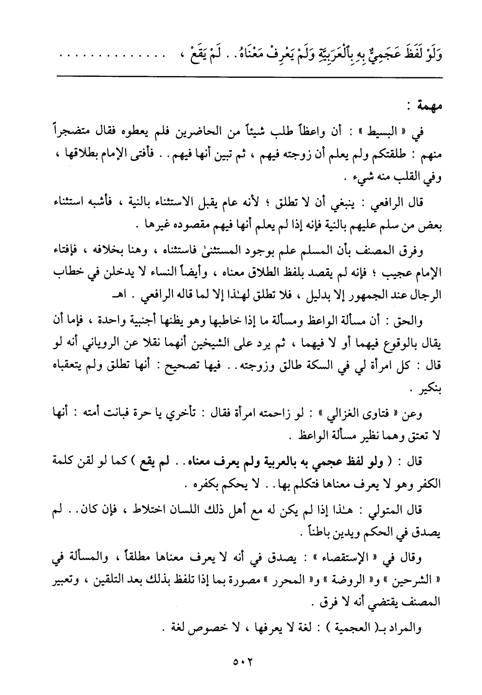 في (البسيط): أن واعظاً طلب شيئاً من الحاضرين فلم يعطوه فقال متضجراً منهم: طلقتكم ولم يعلم أن زوجته فيهم، ثم تبين أنها فيهم .. فأفتى الإمام بطلاقها، وفي القلب منه شيء.