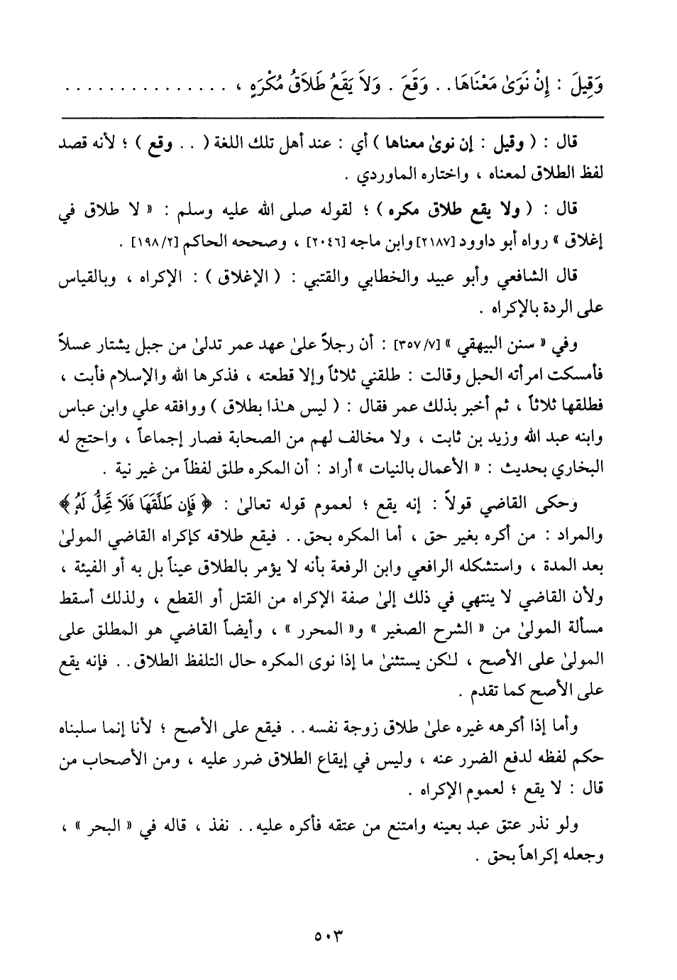 وفي (سنن البيقهي)] 7/ 357 [: أن رجلاً على عهد عمر تدلى من جبل يشتار عسلاً فأمسكت امرأته الحبل وقالت: طلقني ثلاثاً وإلا قطعته، فذكرها الله والإسلام فأبت، فطلقها ثلاثاً، ثم أخبر بذلك عمر فقال: (ليس هذا بطلاق) ووافقه علي وابن عباس وابنه عبد الله وزيد بن ثابت، ولا مخالف لهم من الصحابة فصار إجماعاً، واحتج له البخاري بحديث: (الأعمال بالنيات) أراد: ان المكره طلق لفظاً من غير نية.