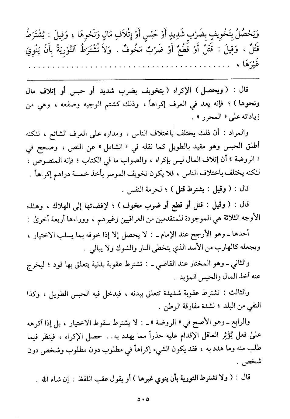 والمراد: ان ذلك يختلف باختلاف الناس، ومداره على العرف الشائع، لكنهأطلق الحبس وهو مقيد بالطويل كما نقله في (الشامل) عن النص، وصحح في (الروضة) أن إتلاف المال ليس بإكراه، والصواب ما في الكتاب؛ فإنه المنصوص، لكنه يختلف باختلاف الناس، فلا يكون تخويف الموسر بأخذ خمسة دراهم إكراهاً.