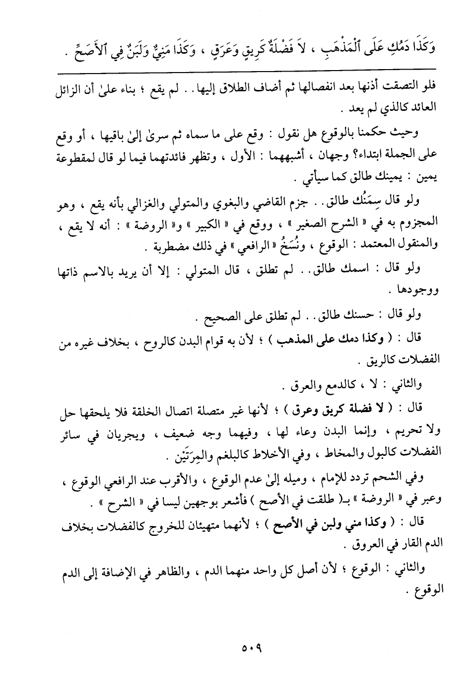 قال: (لا فضلة كريق وعرق)؛ لانها غير متصلة اتصال الخلقة فلا يلحقها حل ولا تحريم، وإنما البدن وعاء لها، وفيهما وجه ضعيف، ويجريان في سائر الفضلات كالبول والمخاط, وفي الأخلاط كالبلغم والمِرَتَيْن.