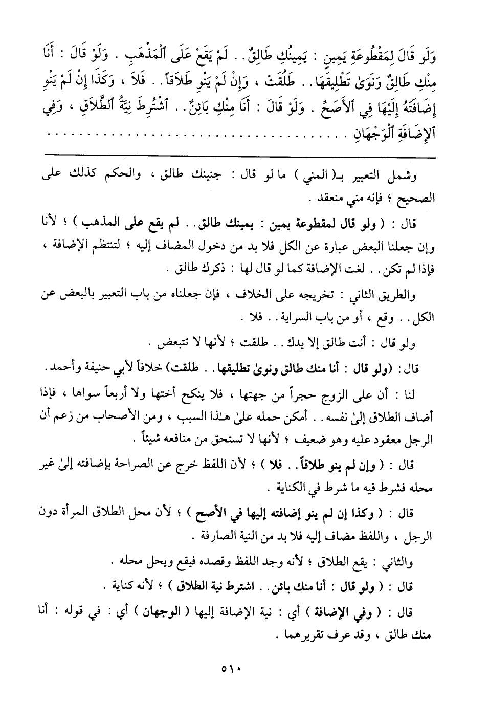 وَلَو قَالَ لِمَقْطُوعَةِ يَمِينٍ: يَمِمينُك طَالِقٌ .. لَمْ يَقَعْ عَلَى الْمَذْهَبِ. وَلَوْ قَالَ: أَنَا مِنْكِ طَالِقٌ وَنَوَى تَطْلِيقَهَاَ .. طَلُقَتْ, وَإِنْ لَمْ يَنْوِ طَلاَقاً .. فَلاَ, وَكَذَا إِنْ لَمْ يَنْوِ إضَافَتْهُ إِلَيْهَا فِي الأَصَحِّ. وَلَوْ قَالَ: أَنَا مِنْكِ بَائِنٌ .. أشْترِطَ نِيِّةُ الطَّلاَقِ, وَفِي الإضَافَةِ الْوَجْهَانِ