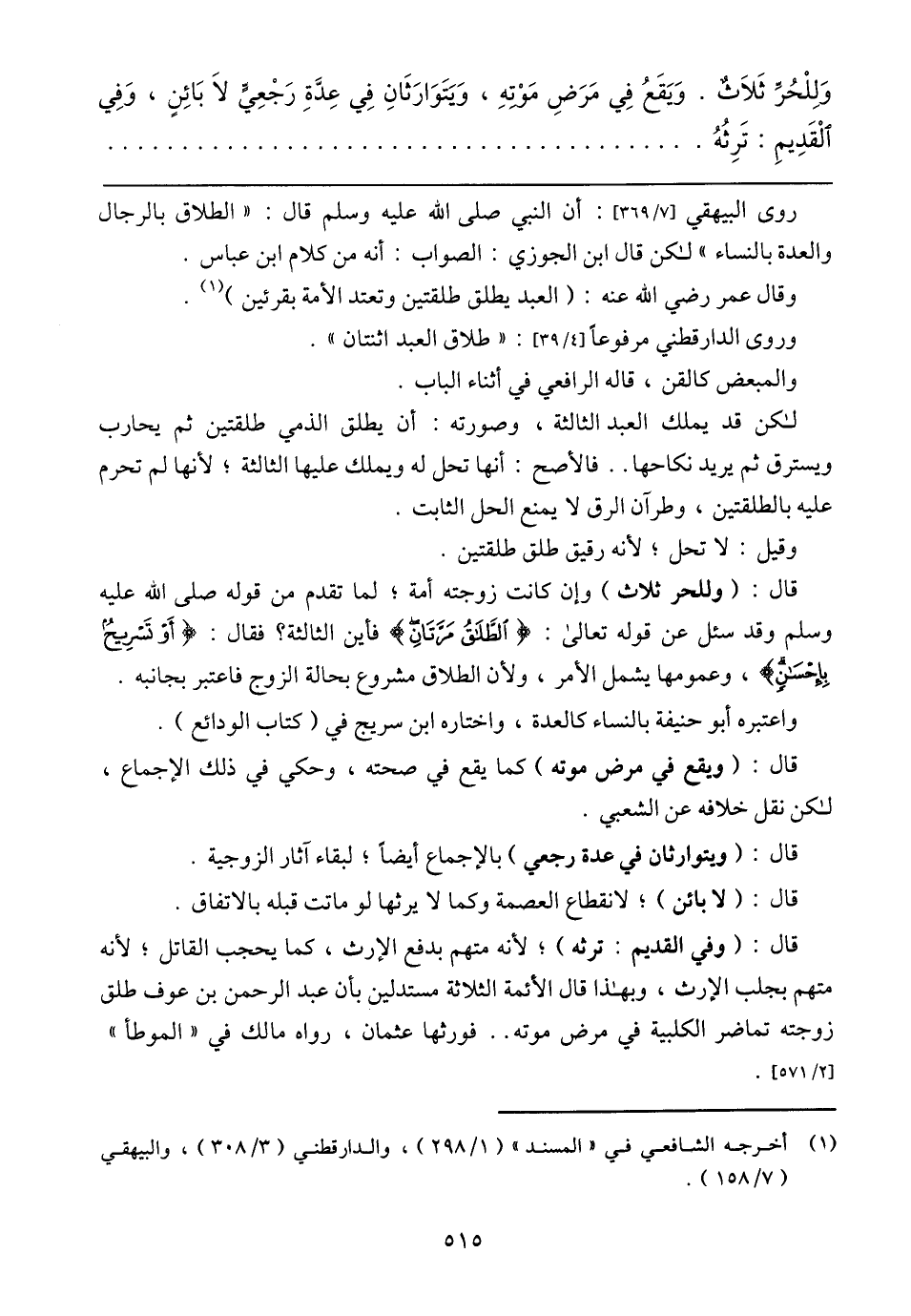 قال: (وفي القديم: ترثه)؛ لأنه متهم بدفع الإرث, كما يحجب القاتل؛ لأنه متهم بجلب الإرث, وبهذا قال الأئمة الثلاثة مستدلين بأن عبد الرحمن بن عوق طلق زوجته تماضر الكلبية في مرض موته .. فورثها عثمان, رواه مالك في (الموطأ) [2/ 571].