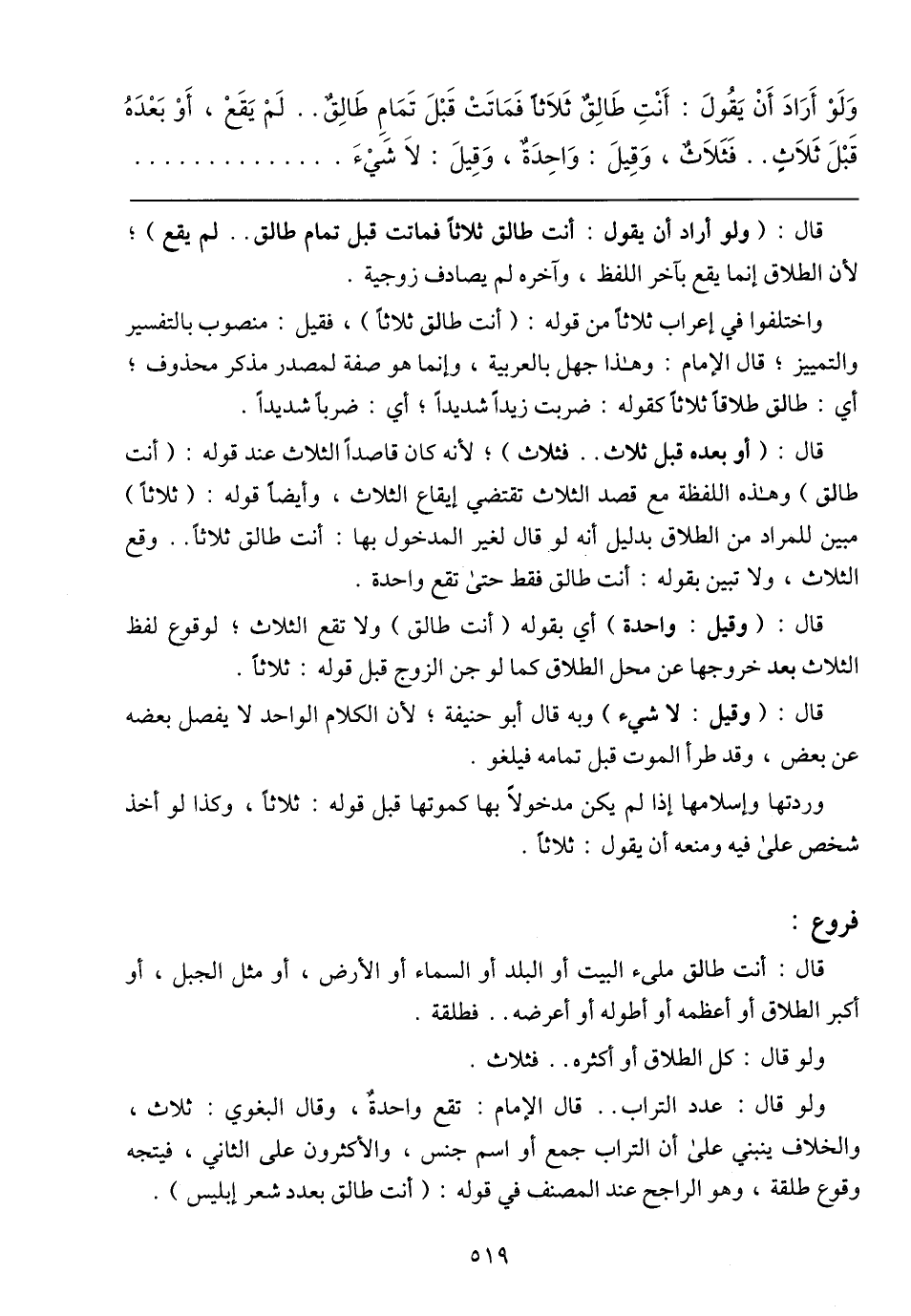 واختلفوا في إعراب ثلاثاً من قوله: (أنت طالق ثلاثاً) , فقيل: منصوب بالتفسير والتمييز؛ قال الإمام: وهذا جهل بالعربية, وإنما هو صفة لمصدر مذكر محذوف؛ أي: طالق طلاقاً ثلاثاً كقوله: ضربت زيداً شديداً؛ أي: ضرباً شديداً.