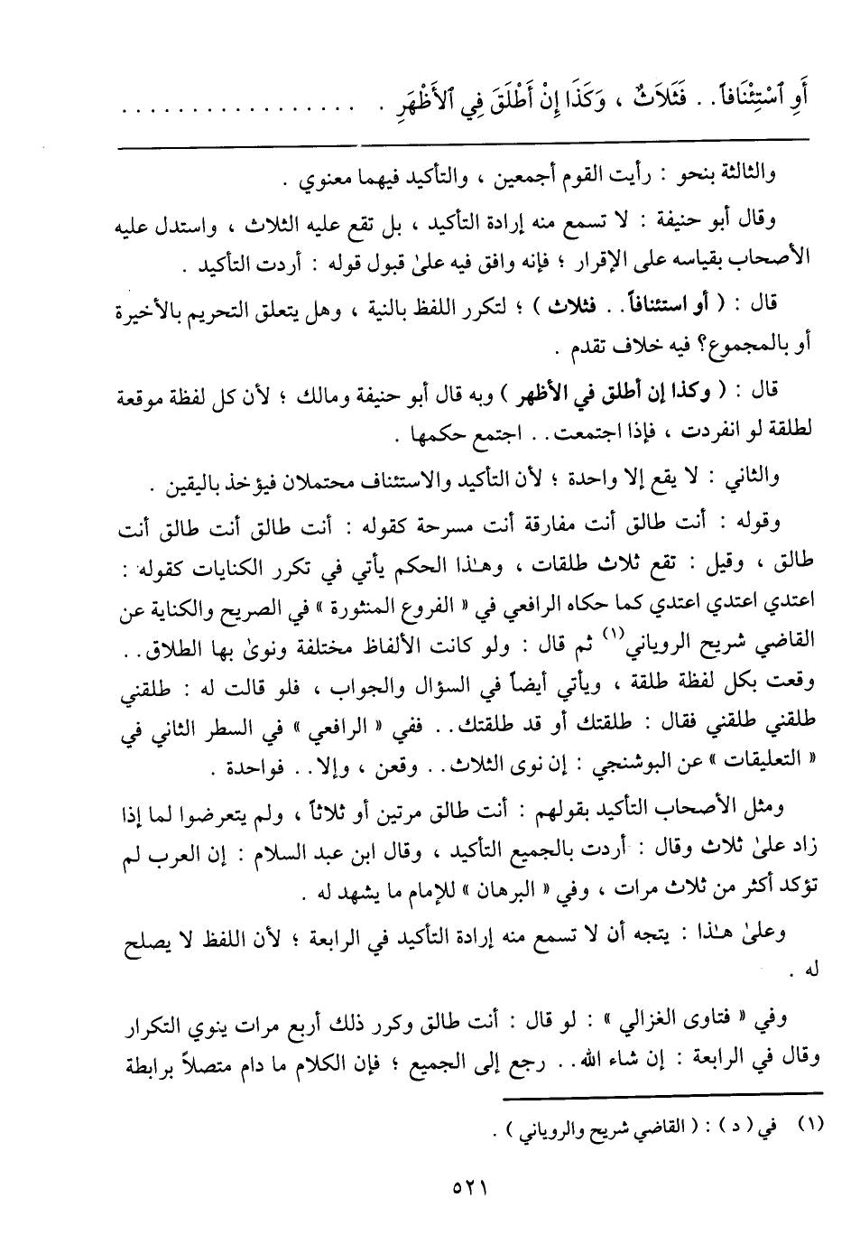 ومثل الأصحاب التأكيد بقولهم: أنت طالق مرتين أو ثلاثاً, ولم يتعرضوا لما إذا زاد على ثلاث وقال: أردت بالجميع التأكيد, وقال ابن عبد السلام: إن العرب لم تؤكد أكثر من ثلاث مرات, وفي (البرهان) للإمام ما يشهد له.