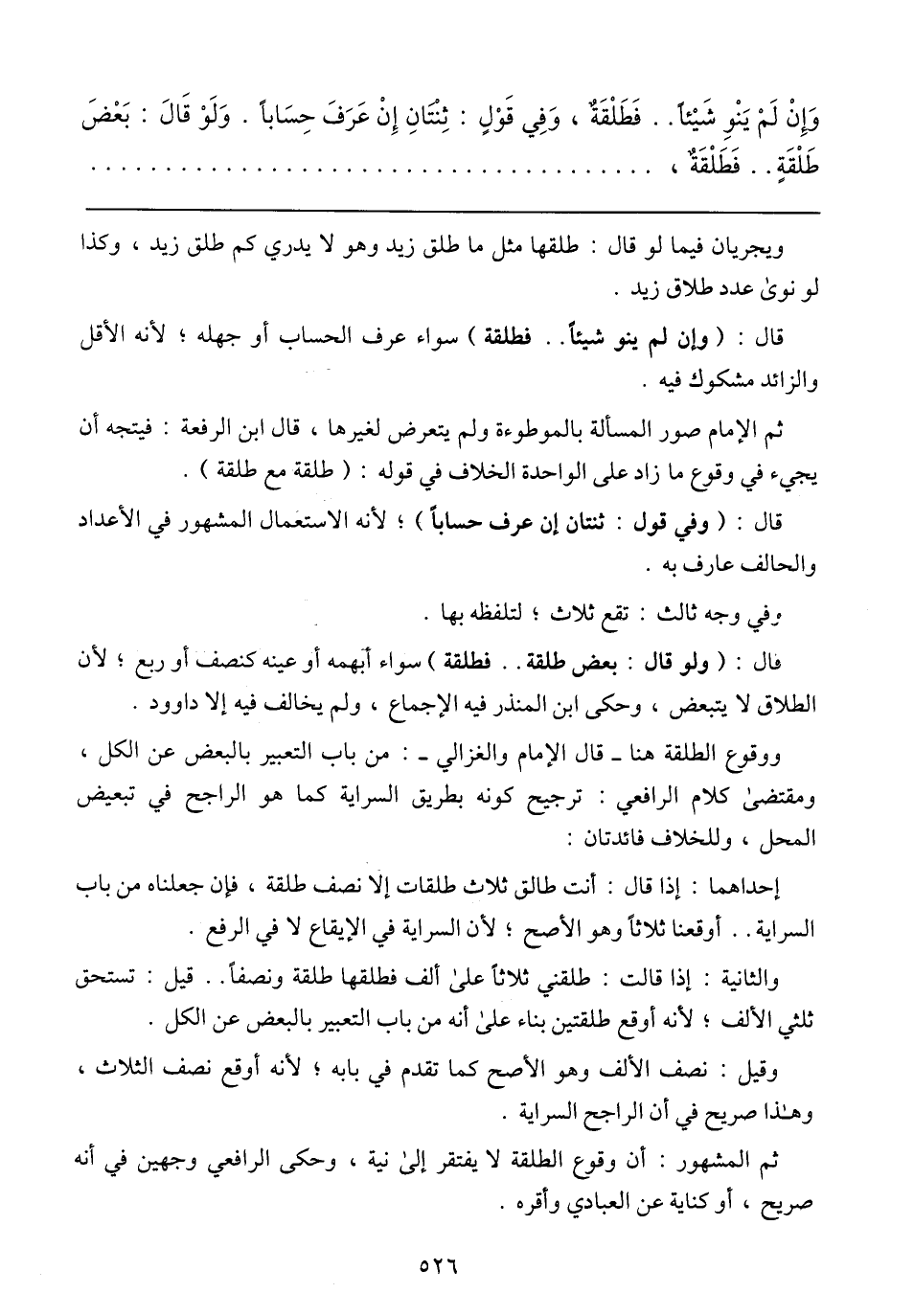 وَإِنْ لَمْ يَنْوِ شَيْئاً .. فَطَلْقَةٌ, وَفِي قَوْلٍ: ثِنْتَانِ إِنْ عَرَفَ حِسَاباً. وَلَوْ قَالَ: بَعْضَ طَلْقَةٍ .. فَطَلْقَةٌ,