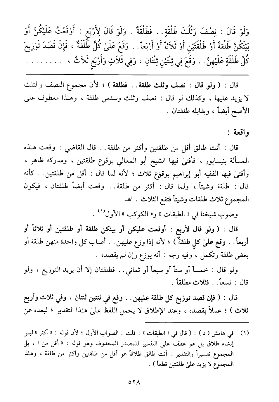 قال: أنت طالق أقل من طلقتين وأكثر من طلقة .. قال القاضي: وقعت هذه المسألة بنيسابور, فافتى فيها الشيخ أبو المعالي بوقوع طلقتين, ومدركه ظاهر, وأفتى فيها الفقيه أبو إبراهيم بوقوع ثلاث؛ لأنه لما قال: أقل من طلقتين .. كأنه قال: طلقة وشيئاً, ولما قال: أكثر من طلقة .. وقعت أيضاً طلقتان, فيكون المجموع ثلاث طلقات وشيئاً فتقع الثلاث. اهـ