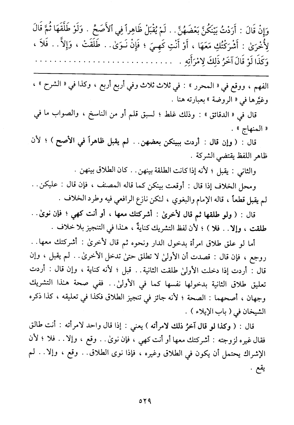 أما لو علق طلاق امرأة بدخول الدار ونحوه ثم قال لأخرى: أشركتك معها .. روجع, فإن قال: قصدت أن الأولى لا تطلق حتى تدخل الأخرى .. لم يقبل, وإن قال: أردت إذا دخلت الأولى طلقت الثانية .. قبل؛ لأنه كناية, وإن قال: أردت تعليق طلاق الثانية بدخولها نفسها كما في الأولى .. ففي صحة هذا التشريك وجهان, أصحهما: الصجة؛ لأنه جائز في تنجيز الطلاق فكذا في تعليقه, كذا ذكره الشيخان في باب الإيلاء).
