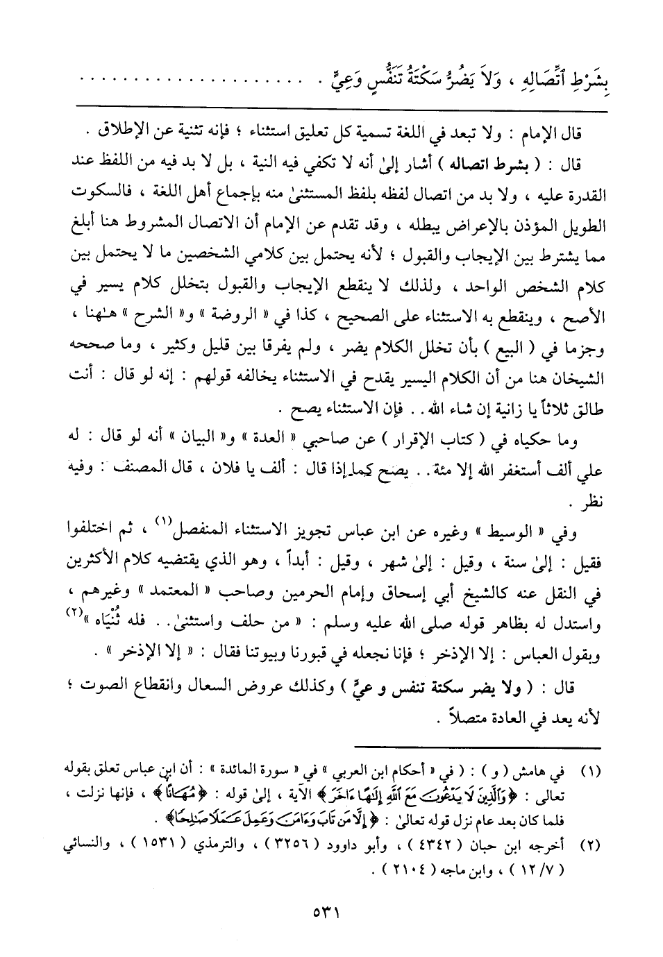 قال الإمام: ولا تبعد في اللغة تسمية كل تعليق استثناء؛ فإنه تثنية عن الإطلاق. قال: (بشرط اتصاله) أشار إلى أنه لا تكفي فيه النية, بل لابد فيه من اللفظ عند القدرة عليه, ولابد من اتصال لفظه بلفظ المستثنى منه بإجماع أهل اللغة, فالسكوت الطويل المؤذن بالإعراض يبطله, وقد تقدم عن الإمام أن الاتصال المشروط هنا أبلغ مما يشترط بين الإيجاب والقبول؛ لأنه يحتمل بين كلامي الشخصين ما لا يحتمل بين كلام الشخص الواحد, ولذلك لا ينقطع الإيجاب والقبول بتخلل كلام يسير في الأصح, وينقطع به الاستثناء على الصحيح, كذا في (الروضة) و (الشرح) ههنا, وجزماً في (البيع) بأن تخلل الكلام يضر, ولم يفرقا بين قليل وكثير, وما صححه الشيخان هنا من أن الكلام اليسير يقدح في الاستثناء يخالفه قولهم: إنه لو قال: أنت طالق ثلاثاً يا زانية إن شاء الله .. فإن الاستثناء يصح.