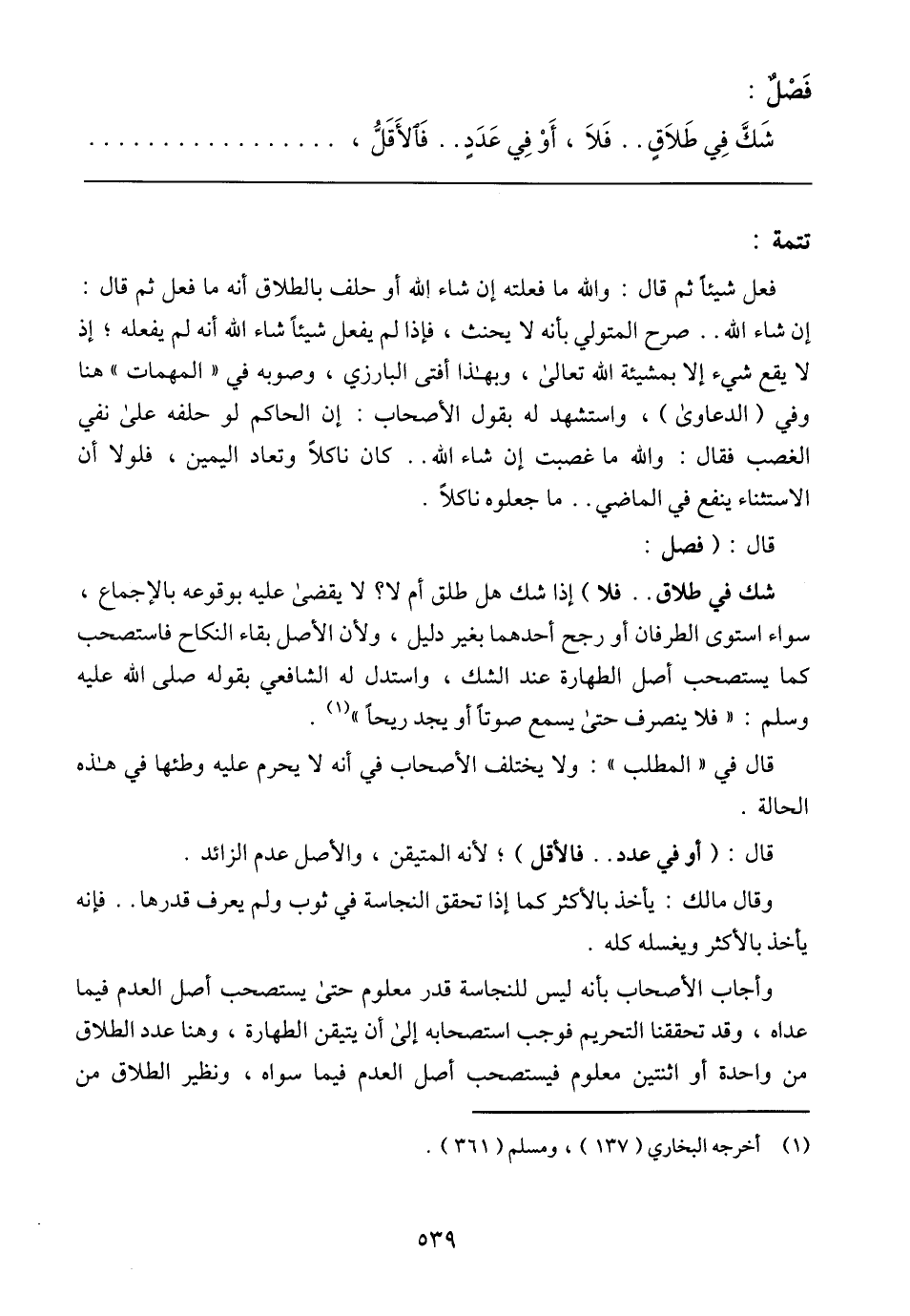 قال: (فصل: شك في طلاق .. فلا) إذا شك هل طلق أم لا؟ لا يقضى عليه بوقوعه بالإجماع، سواء استوى الطرفان أو رجح أحدهما بغير دليل، ولأن الأصل بقاء النكاح فاستصحب كما يستصحب أصل الطهارة عند الشك، وأستدل له الشافعي بقوله صلى الله عليه وسلم: (فلا ينصرف حتى يسمع صوتاً أو يجد ريحاً).