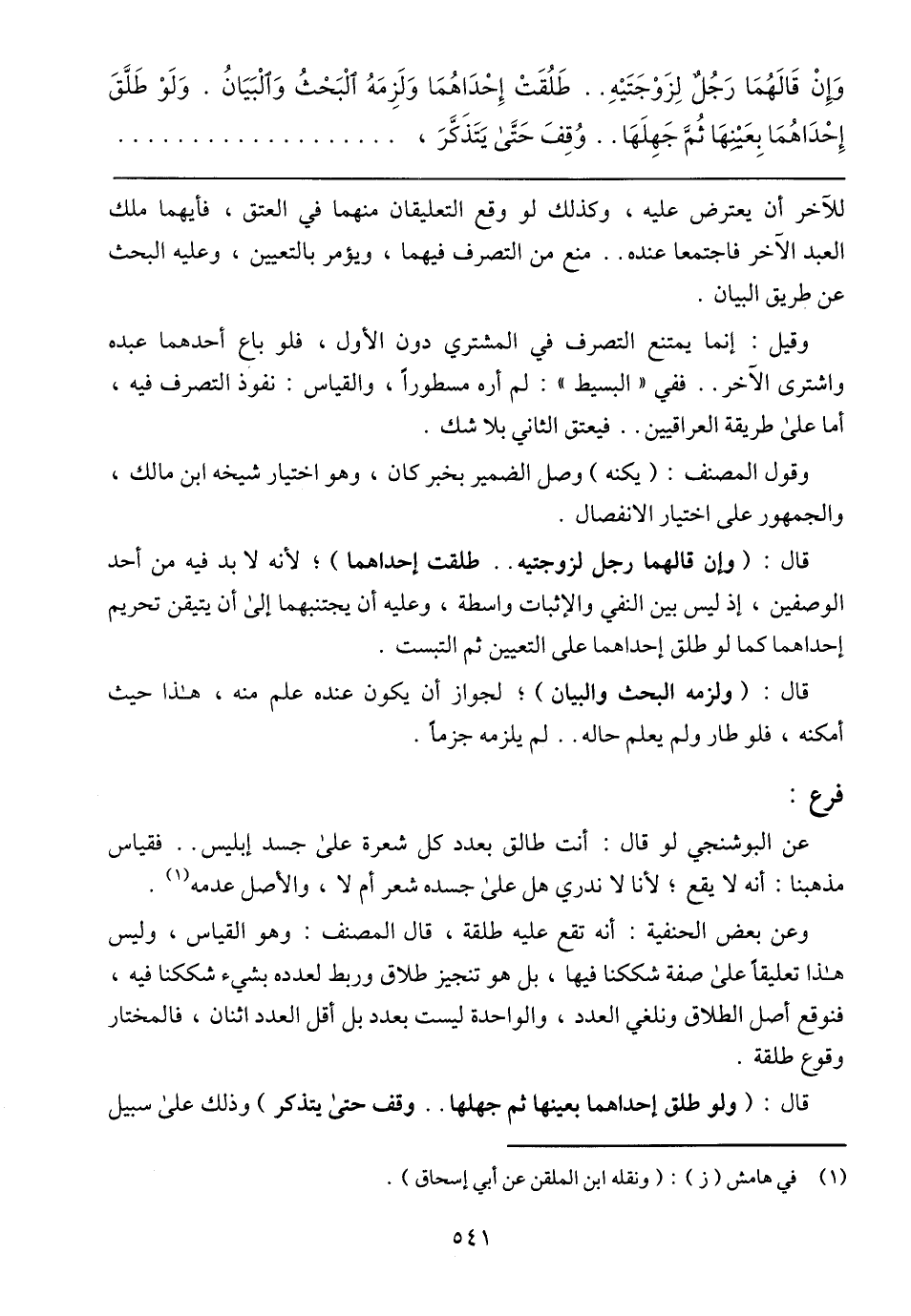 وَإِنْ قَالَهُمَا رَجُلٌ لِزَوْجَتَيْهِ .. طَلُقَتْ إِحْدِاهُمَا وَلَزِمَهُ الْبَحْثُ وَالْبَيَانُ. وَلَوْ طَلَّقَ إِحْدَاهُمَا بِعَيْنِهَا ثُمَّ جَهِلَهَا .. وُقِفَ حَتَّى يَتَذَكَّرَ،