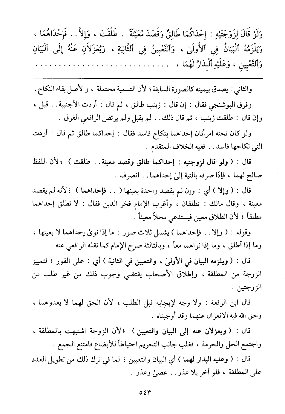 وَلَوْ قَالَ لِزَوْجَتَيْهِ: إِحْدَاكُمَا طَالِقٌ وَقَصَدَ مُعَيَّنَةً .. طَلُقَتْ، وَإِلاَّ .. فَإِحْدَاهُمَا، وَيَلْزَمُهُ الْبَيَانُ فِي الأُولَى، وَالتَّعْيِينُ فِي الثَّانِيَةِ، وَيُعْزَلاَنِ عَنْهُ إِلِى الْبَيَانِ وَالتَّعْيِينِ، وَعَلَيْهِ الْبِدَارُ لَهُمَا،