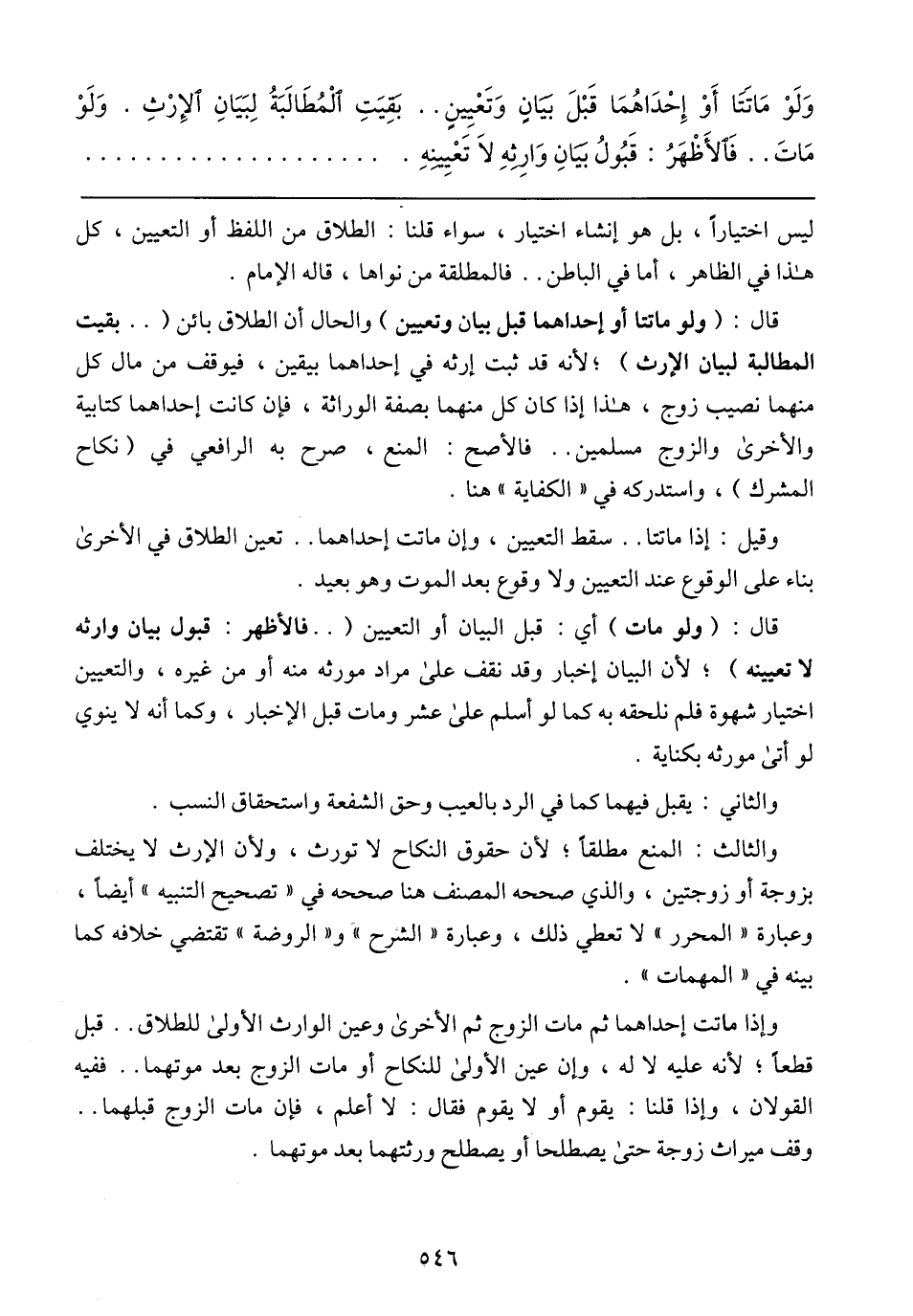 قال: (ولو ماتتا أو إحداهما قبل بيان وتعيين) والحال أن الطلاق بائن (.. بقيت المطالبة لبيان الإرث)؛ لأنه قد ثبت إرثه في إحداهما بيقين، فيوقف من مال كل منهما نصيب زوج، هذا إذا كان كل منهما بصفة الوراثة، فإن كانت إحداهما كتابية والأخرى والزوج مسلمين .. فالأصح: المنع، صرح به الرافعي في (نكاح المشرك)، واستدركه في (الكفاية) هنا.