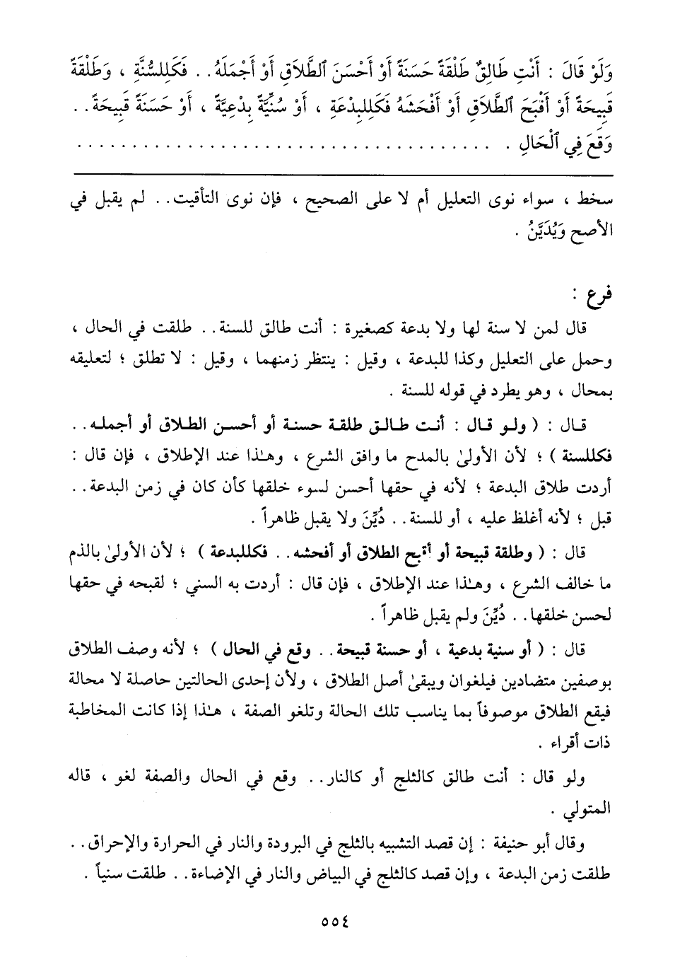 قال: (أو سنية بدعية، أو حسنة قبيحة .. وقع في الحال)؛ لأنه وصف الطلاق بوصفين متضادين فيلغوان ويبقى أصل الطلاق، ولأن إحدى الحالتين حاصلة لا محالة فيقع الطلاق موصوفاً بما يناسب تلك الحالة وتلغو الصفة، هذا إذا كانت المخاطبة ذات أقراء.