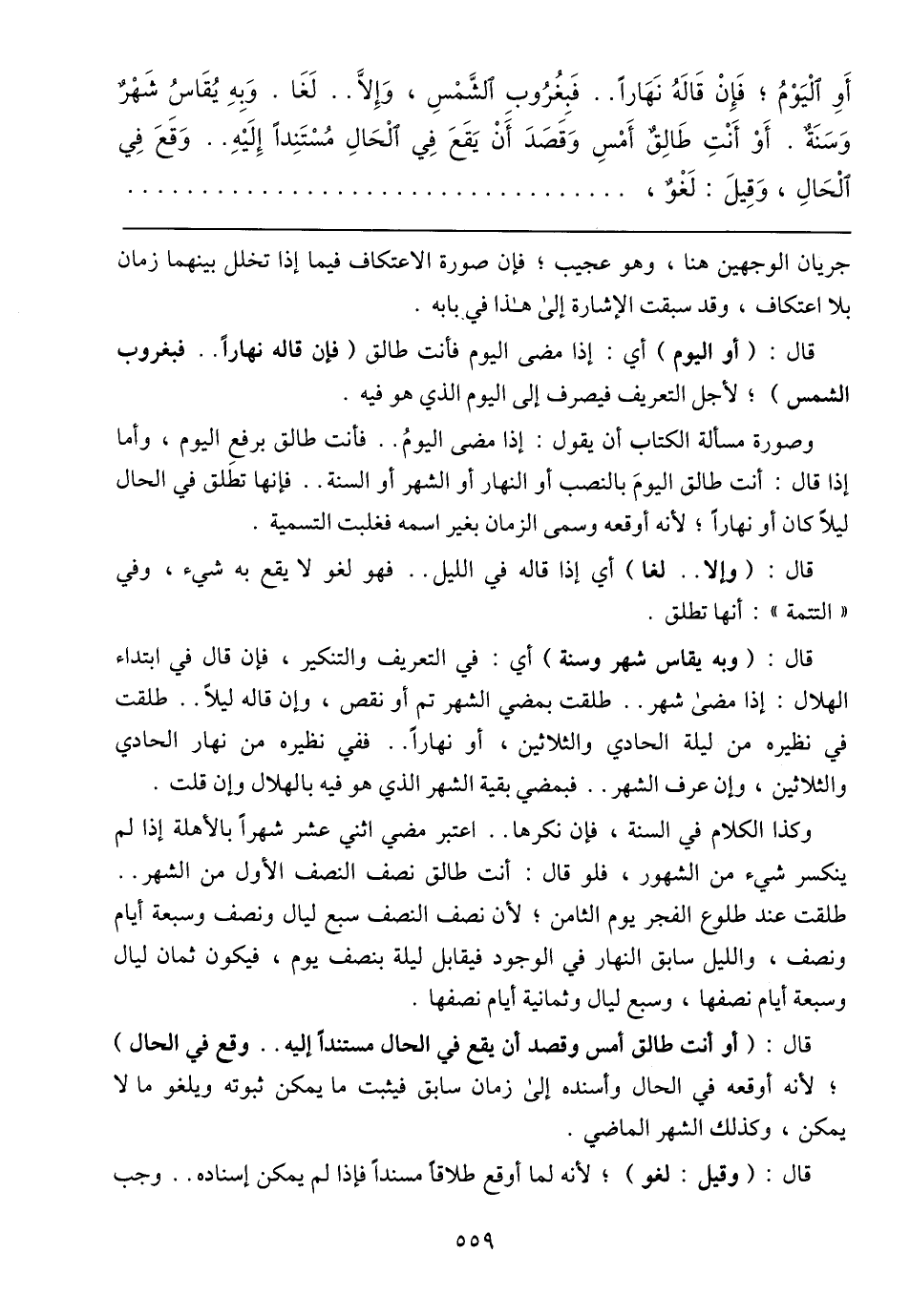 أَوِ اٌليَومُ؛ فَإِنْ قَالَهُ نَهَاراً .. فَبِغُرُوبِ اٌلشَمْسِ، وَإِلاَّ .. لَغَا. وَبِهِ يُقَاسُ شَهْرٌ وَسَنَةٌ. أَوْ أَنْتِ طَالِقٌ أَمْسِ وَقَصَدَ أَنْ يَقَعَ فِي اٌلْحَالِ مُسْتَنِداً إِلَيْهِ .. وَقَعَ فِي اٌلْحَالِ، وَقِيلَ: لَغْوٌ،