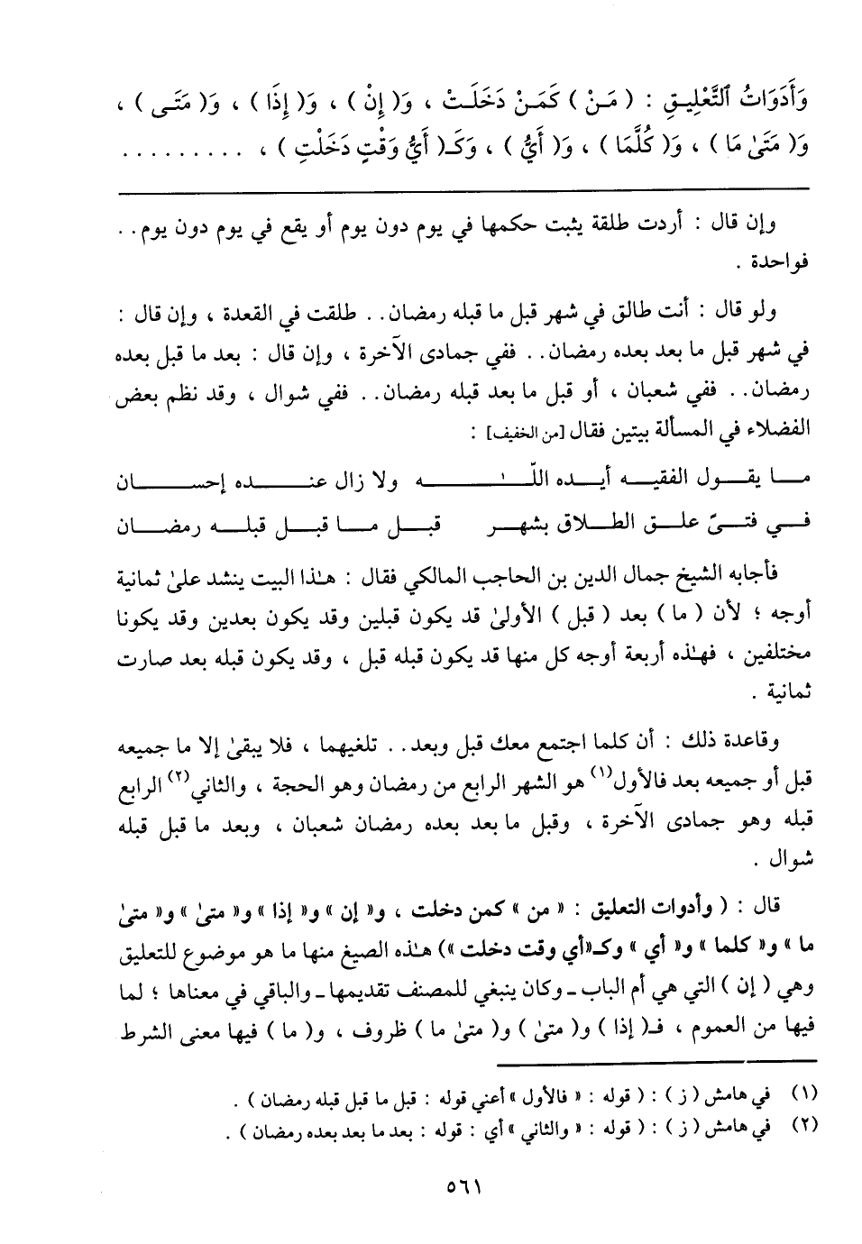 فأجابه الشيخ جمال الدين بن الحاجب المالكي فقال: هذا البيت ينشد على ثمانية أوجه؛ لأن (ما) بعد (قبل) الأولي قد يكون قبلين وقد يكون بعدين وقد يكونا مختلفين، فهذه أربعة أوجه كل منها قد يكون قبله قبل، وقد يكون قبله بعد صارت ثمانية.