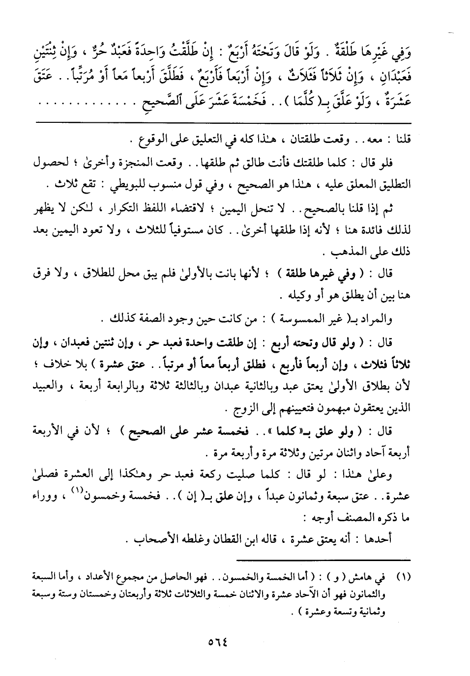 وَفِي غَيْرِهَا طَلْقَةٌ. وَلَوْ قَالَ وَتَحْتَهُ أَرْبَعٌ: إِنْ طَلَّقْتُ وَاحِدَهً فَعَبْدٌ حُرٌ، وَإِنْ ثِنْتَتٌينِ فَعَبْدَانِ، وَإِنْ ثَلاثً فَثَلاَثٌ، وَإِنْ أَرْبَعاً فَأَرْبَعٌ، فَطَلَّقَ أَرْبعاً مَعاً أَوْ مُرَتَّباً .. عَتَقَ عَشَرَةٌ، وَلَوْ عَلَّقَ بِ (كُلَّمَا) .. فَخَمْسَةَ عَشَرَ عَلَى اُلصَّحيحِ
