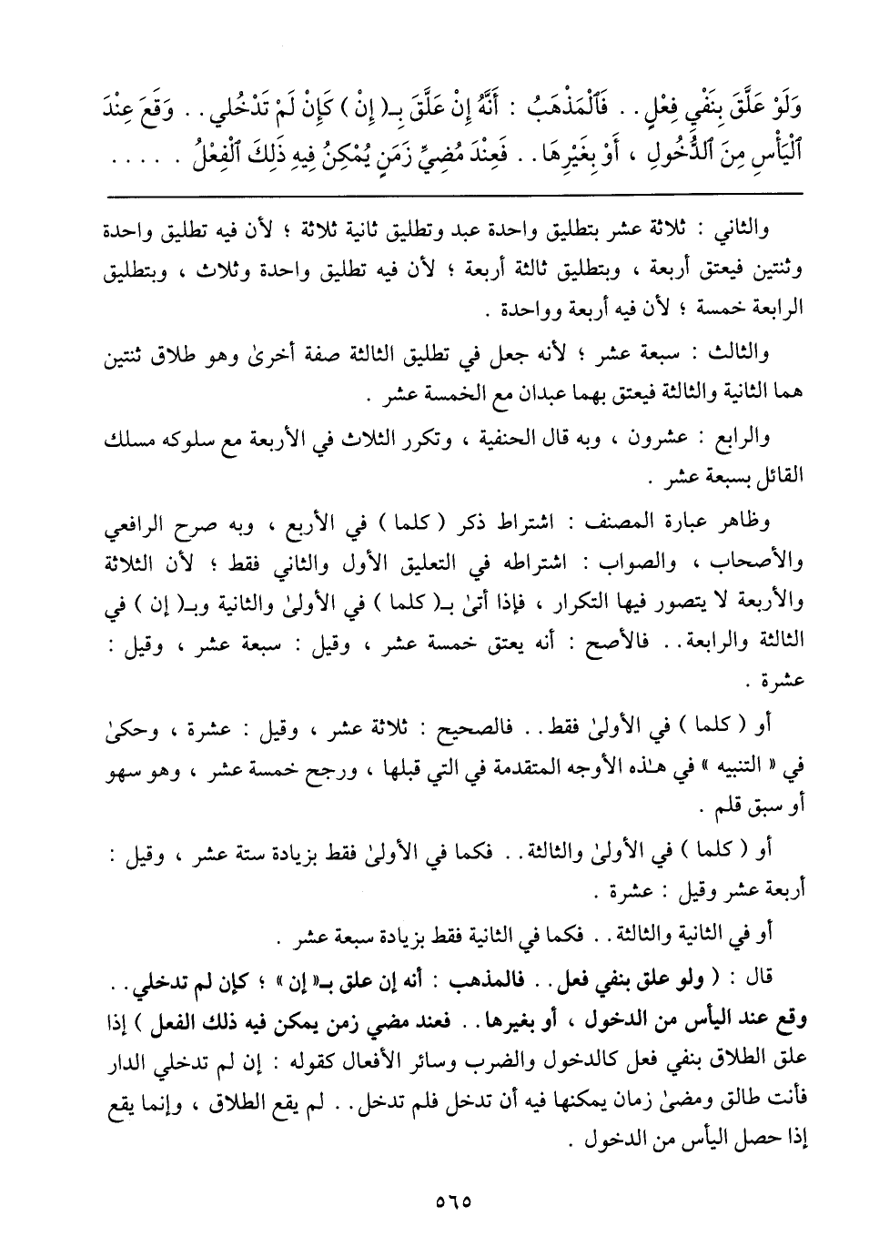 وَلَوْ عَلَّقَ بِنَفْيِ فِعْلِ .. فَاُلْمَذْهَبُ: أَنَّهُ إِنْ عَلَّقَ بِـ (إِنْ) كَإِنْ لَمْ تَدْخُلي .. وَقَعَ عِنْدَ اٌلْيَاسِ مِنَ اُلدُّخُولِ، أَوْ بِغَيْرِهَا .. فَعِنْدَ مُضِيِّ زَمَنٍ يُمْكِنُ فِيهِ ذَلِكَ اُلْفِعْلُ