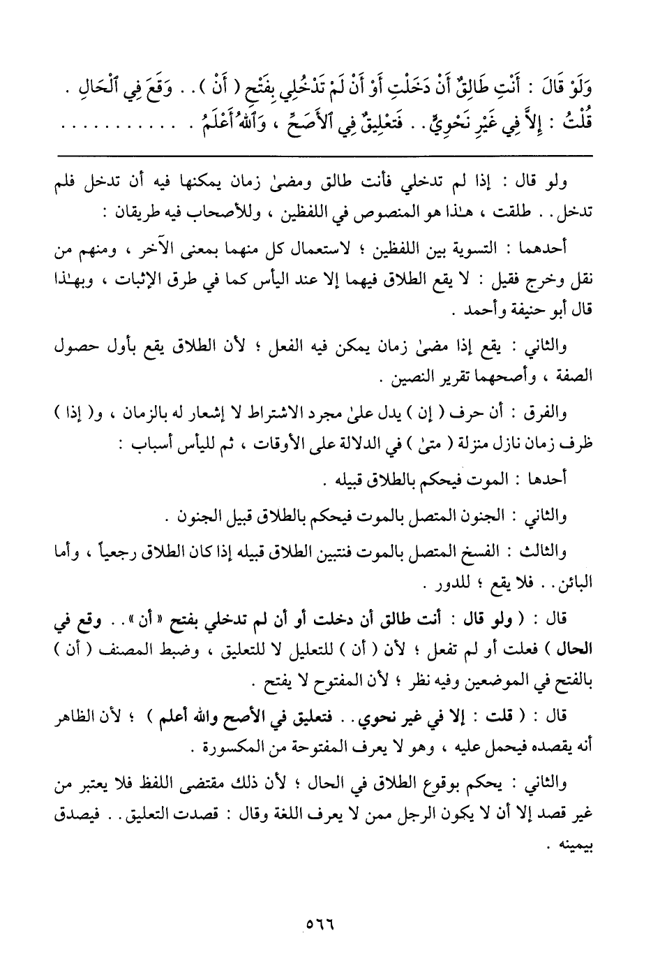 وَلَوْ قَالَ: أَنْتِ طَالِقٌ أَنْ دَخَلْتِ أَوْ أَنْ لَمْ تَدْخُلِي بِفَتْحِ (أَنْ) .. وَقَعَ فِي اٌلْحَالِ. قُلْتُ: إِلاَّ فِي غَيْرِ نَحْوِيٍّ .. فَتعْلِيقٌ فِي اٌلأَصَحِّ، وَاُللهُ أَعْلَمُ