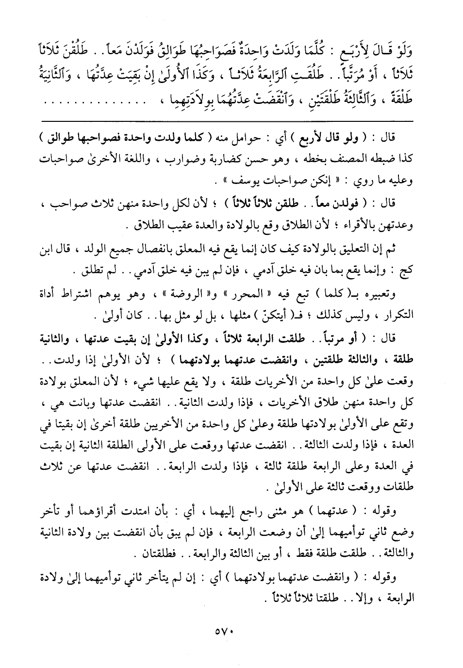 وَلَوْ قَالَ لِأَرْبَعٍ: كُلَمَا وَلَدَتْ وَاحِدَةٌ فَصَوَاحِبُهَا طَوَالِقُ فَوَلَدْانَ مَعًا .. طَلُقْنَ ثَلَاثًا ثَلَاثًا, أَوْ مُرَتَّبًا .. طَلُقَتِ الرَّابِعَةُ ثَلَاثًا,