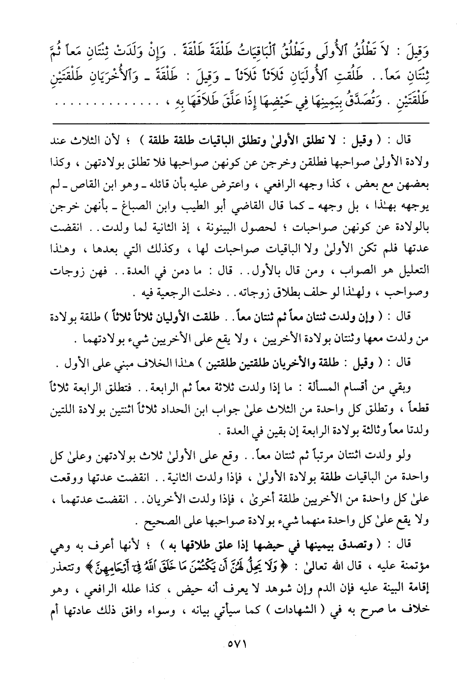 قال: (وقيل: لا تطلق الأولى وتطلق الباقيات طلقة طلقة)؛ لأن الثلاث عند ولادة الأولى صواحبها فطلقن وخرجن عن كونهن صواحبها فلا تطلق بولادتهن, وكذا بعضهن مع بعض, كذا وجهه الرافعي, واعترض عليه بأن قائله- وهو ابن القاص- لم يوجهه بهذا, بل وجهه- كما قال القاضي أبو الطيب وابن الصباغ- بأنهن خرجن بالولادة عن كونهن صواحبات؛ لحصول البينونة, إذ الثانية لما ولدت .. انقضت عدتها فلم تكن الأولى ولا الباقيات صواحبات لها, وكذلك التي بعدها, وهذا التعليل هو الصواب, ومن قال بالأول .. قال: ما دمن في العدة .. فهن زوجات وصواحب, ولهذا لو حلف بطلاق زوجاته .. دخلت الرجعية فيه.