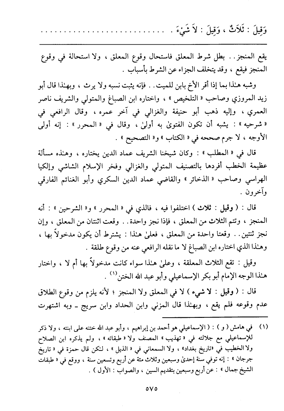 وقيل: تقع الثلاث المعلقة, وعلى هذا سواء كانت مدخولًا بها أم لا, واختار هذا الوجه الإمام أبو بكر الإسماعيلي وأبو عبد الله الختن.