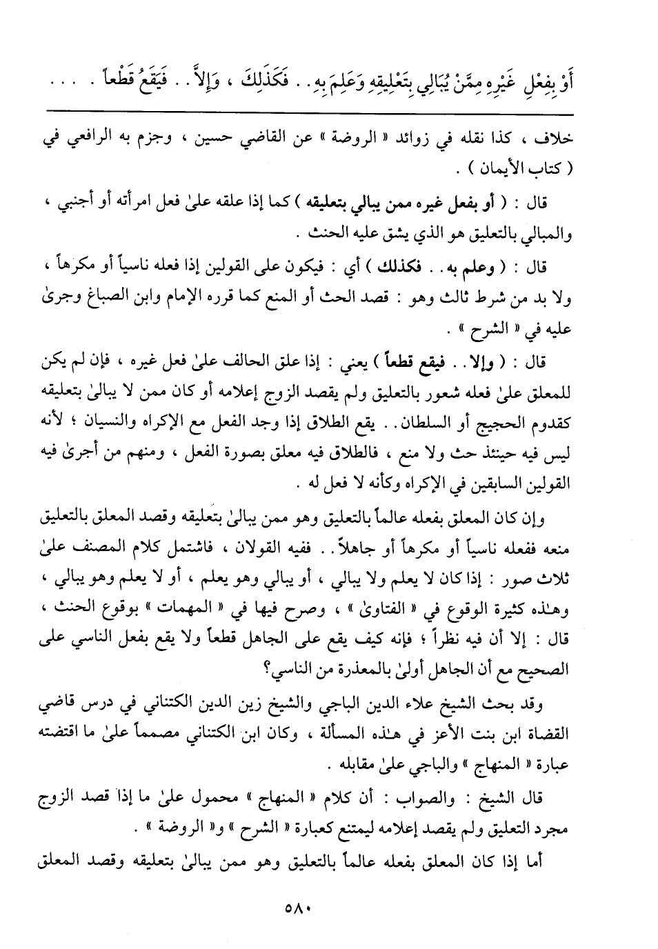 وإن كان المعلق بفعله عالمًا بالتعليق وهو ممن يبالى بتعليقه وقصد المعلق بالتعليق منعه ففعله ناسيًا أو مكرهًا أو جاهلًا ... ففيه القولان, فاشتمل كلام المصنف على ثلاث صور: إذا كان لا يعلم ولا يبالي, أو يبالي وهو يعلم, أو لا يعلم وهو يبالي, وهذه كثيرة الوقوع في (الفتاوى) , وصرح فيها في (المهمات) بوقوع الحنث, قال: إلا أن فيه نظرًا؛ فإنه كيف يقع على الجاهل قطعًا ولا يقع بفعل الناسي على الصحيح مع أن الجاهل أولى بالمعذرة من الناسي؟