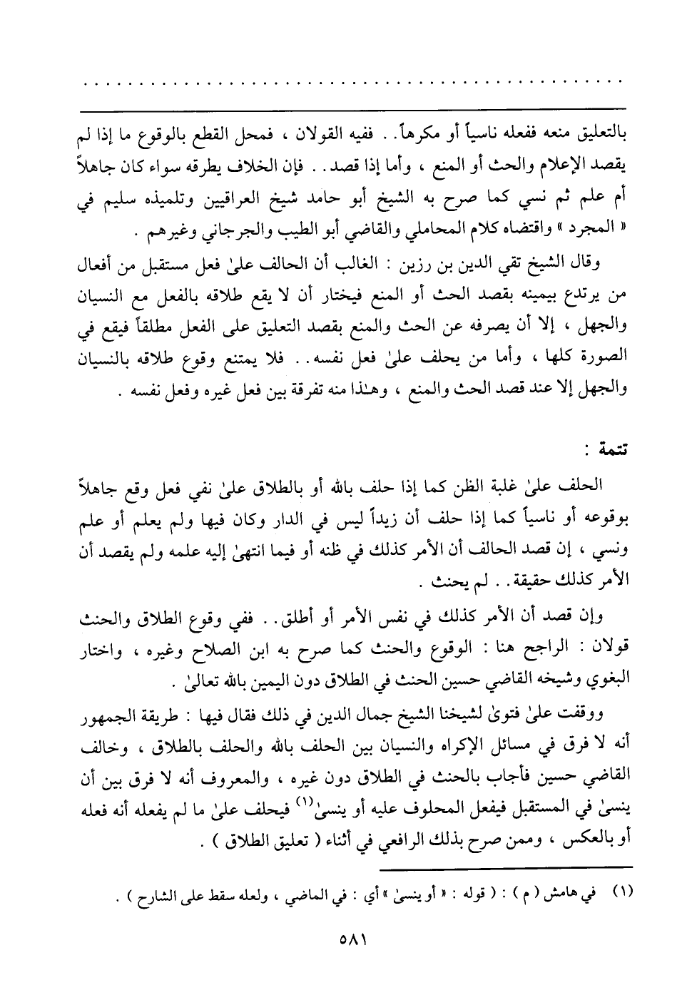 وقال الشيخ تقي الدين بن رزين: الغالب أن الحالف على فعل مستقبل من أفعال من يرتدع بيمينه بقصد الحث والمنع بقصد التعليق على الفعل مطلقًا فيقع في الصورة كلها, وأما من يحلف على فعل نفسه ... فلا يمتنع وقوع طلاقه بالنسيان والجهل إلا عند قصد الحث والمنع, وهذا منه تفرقة بين فعل غيره وفعل نفسه.
